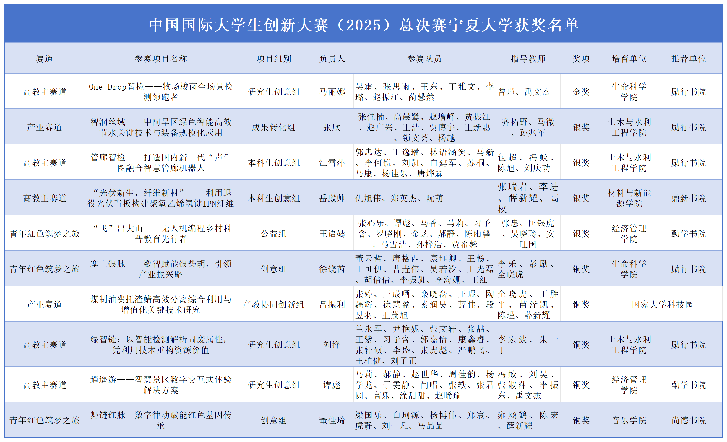 【宁夏大学新闻中心讯 创新创业学院(大学科技园办公室)】10月13日至15日,中国国际大学生创新大赛(2025)总决赛在郑州大学圆满落幕,我校参赛团队经过激烈角逐,凭借出色的创新能力和扎实的项目实力,斩获金奖1项,银奖4项和铜奖5项,《“飞”出大山》项目成功入选大赛优秀项目展(宁夏唯一)。