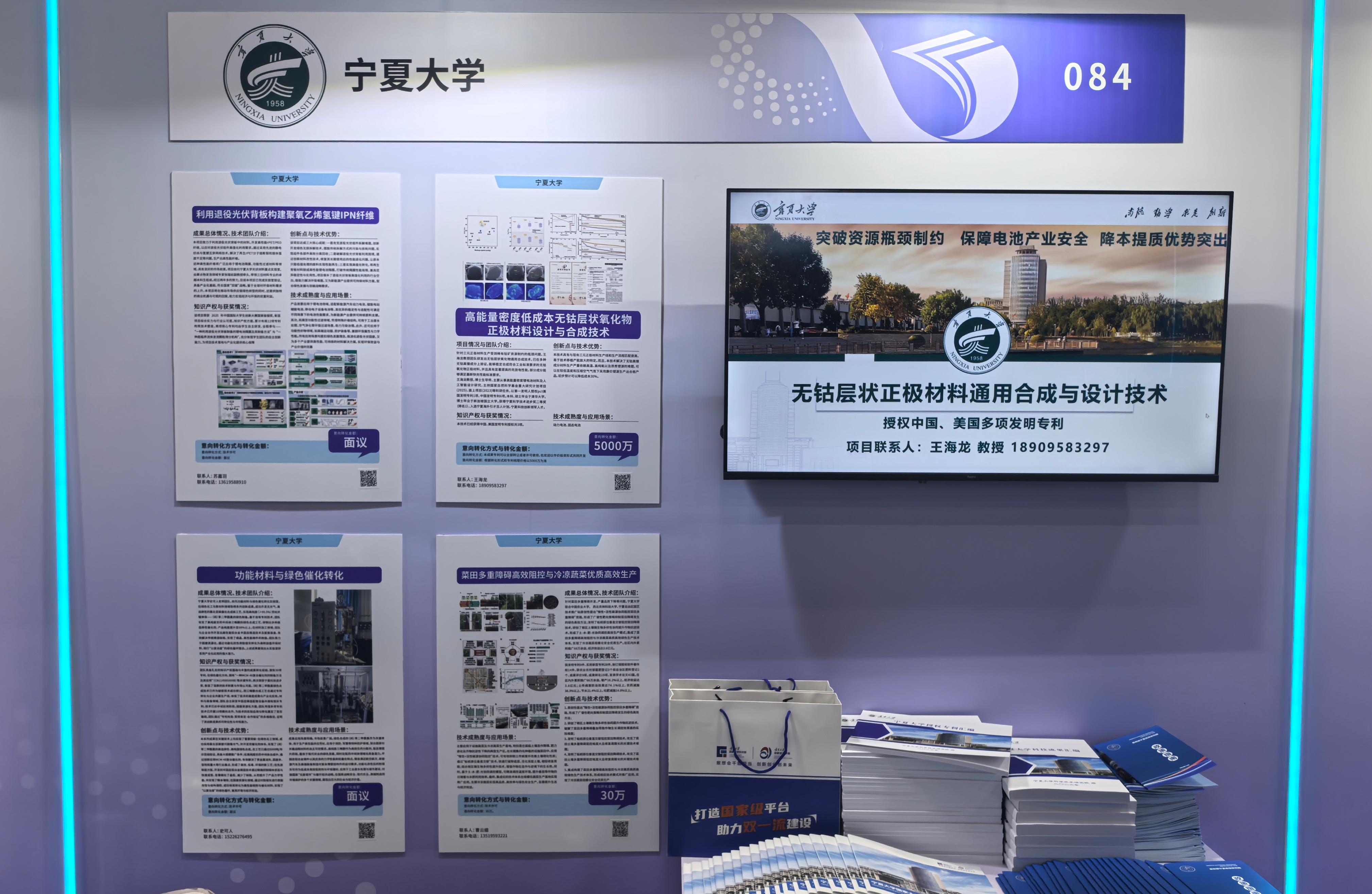 宁夏大学携多项优质科研成果亮相本届科交会,通过视频播放的形式展示成果近100项,成果汇编、专利汇编的形式展示科研成果近2000项,专利近1500项。“高能量密度低成本无钴层状氧化物正极材料设计与合成技术”“功能材料与绿色催化转化”“利用退役光伏背板构建聚氧乙烯氢键IPN纤维”等材料领域创新成果,以及“菜田多重障碍高效阻控与冷凉蔬菜优质高效生产”等农业领域标志性成果,集中展示了学校在材料科学、现代农业等特色方向的科研积累与创新能力,彰显了学校主动对接国家战略需求、服务产业发展的使命担当。