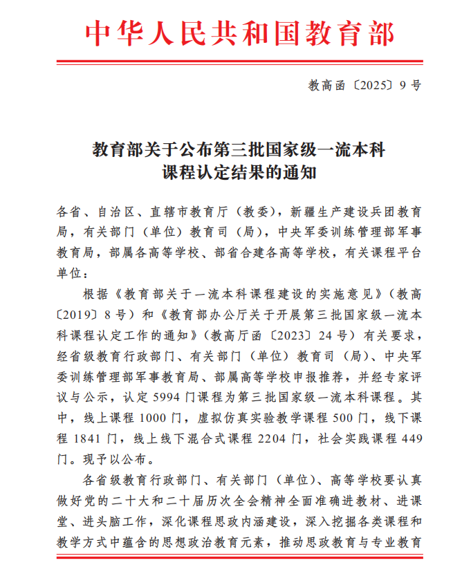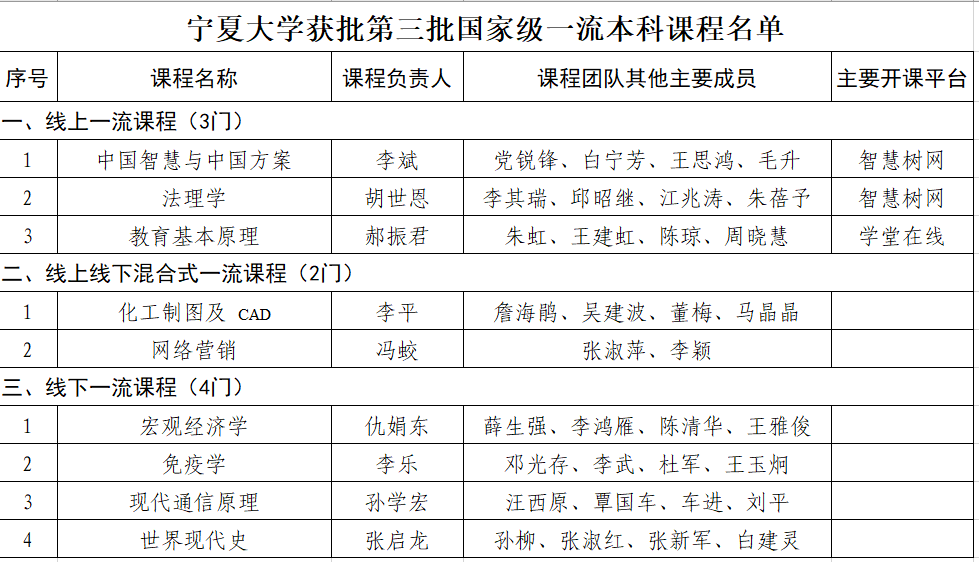 【宁夏大学新闻中心讯 本科生院】近日,教育部公布了第三批国家级一流本科课程认定结果。宁夏大学9门课程成功获批国家级一流本科课程,其中线上课程3门,线下课程4门,线上线下混合式课程2门。9门课程涵盖了多个学科领域,课程类型丰富多样,每一门课程在教学内容、教学方法、教学团队等方面都独具特色,展现出学校在课程建设方面的深厚底蕴和创新能力。