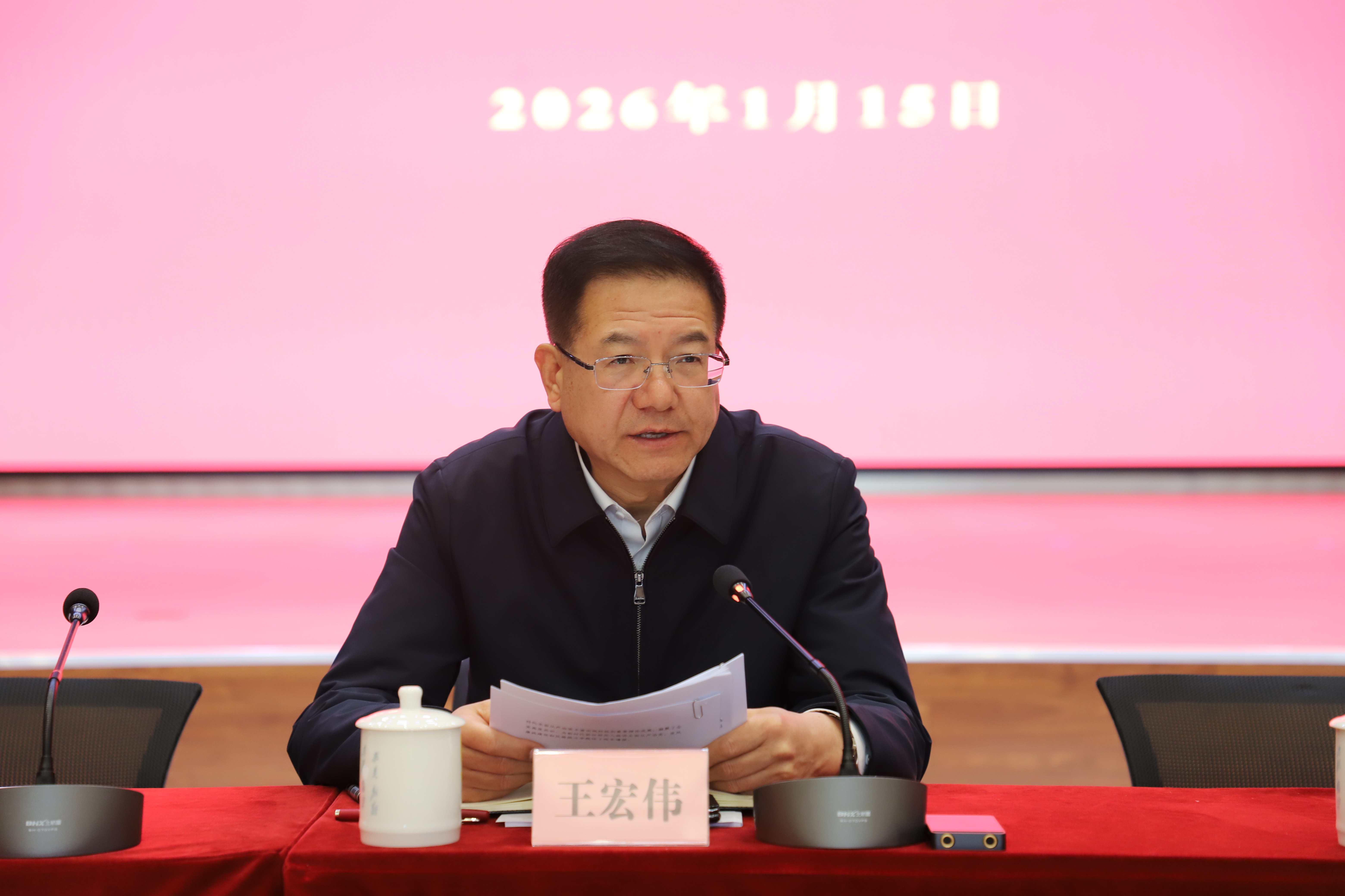 【宁夏大学新闻中心讯 王文娣/文、图】1月15日,2026年校党委理论学习中心组(扩大)第1次学习会在笃行楼3楼报告厅召开,校党委书记王宏伟主持会议。