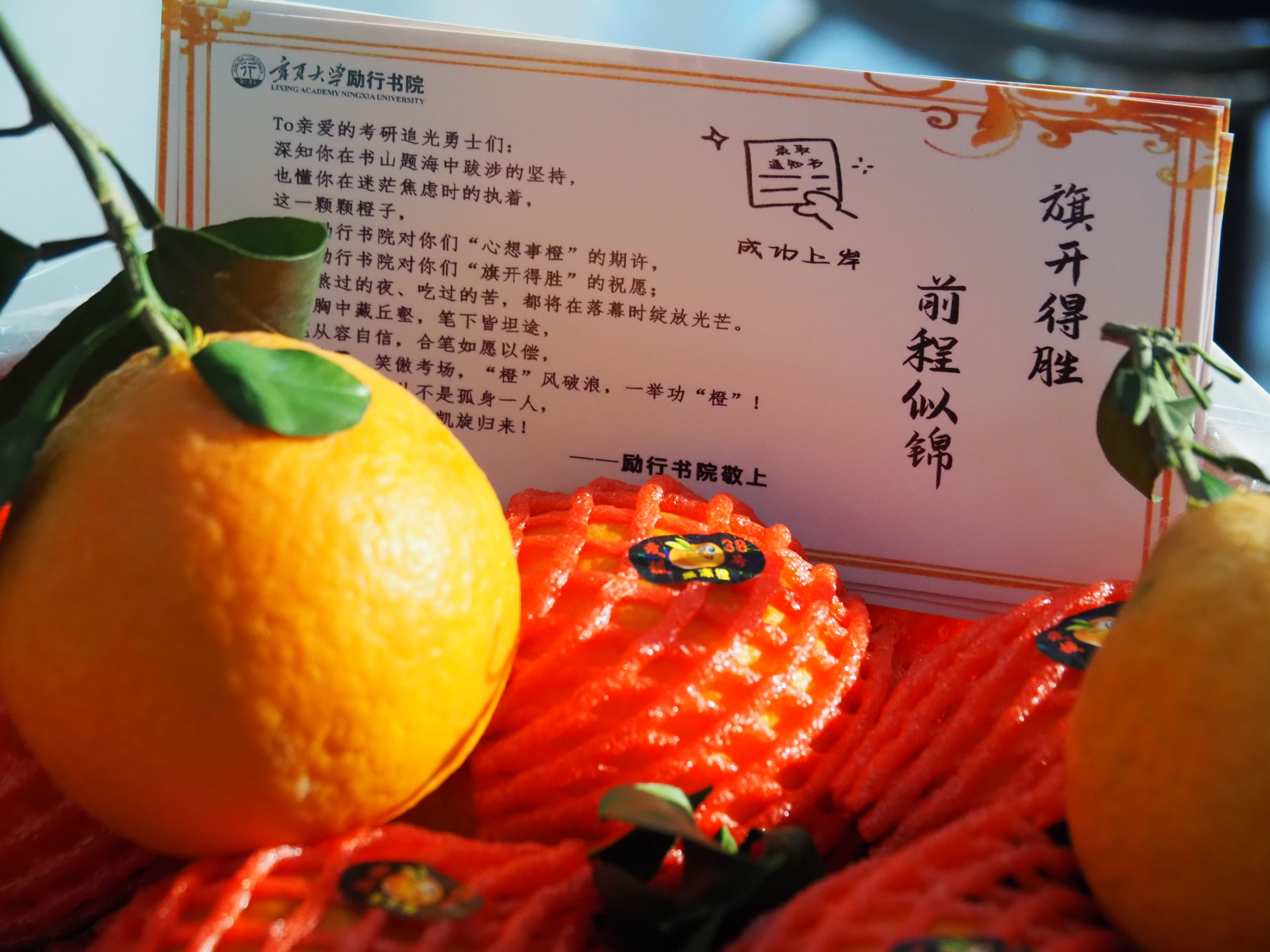 【宁夏大学新闻中心讯 励行书院】12月10日至11日,励行书院启动“心想事‘橙’ 研途有你”考研慰问系列活动,用一份诚意满满的祝福,为每一位考研人加油续航。