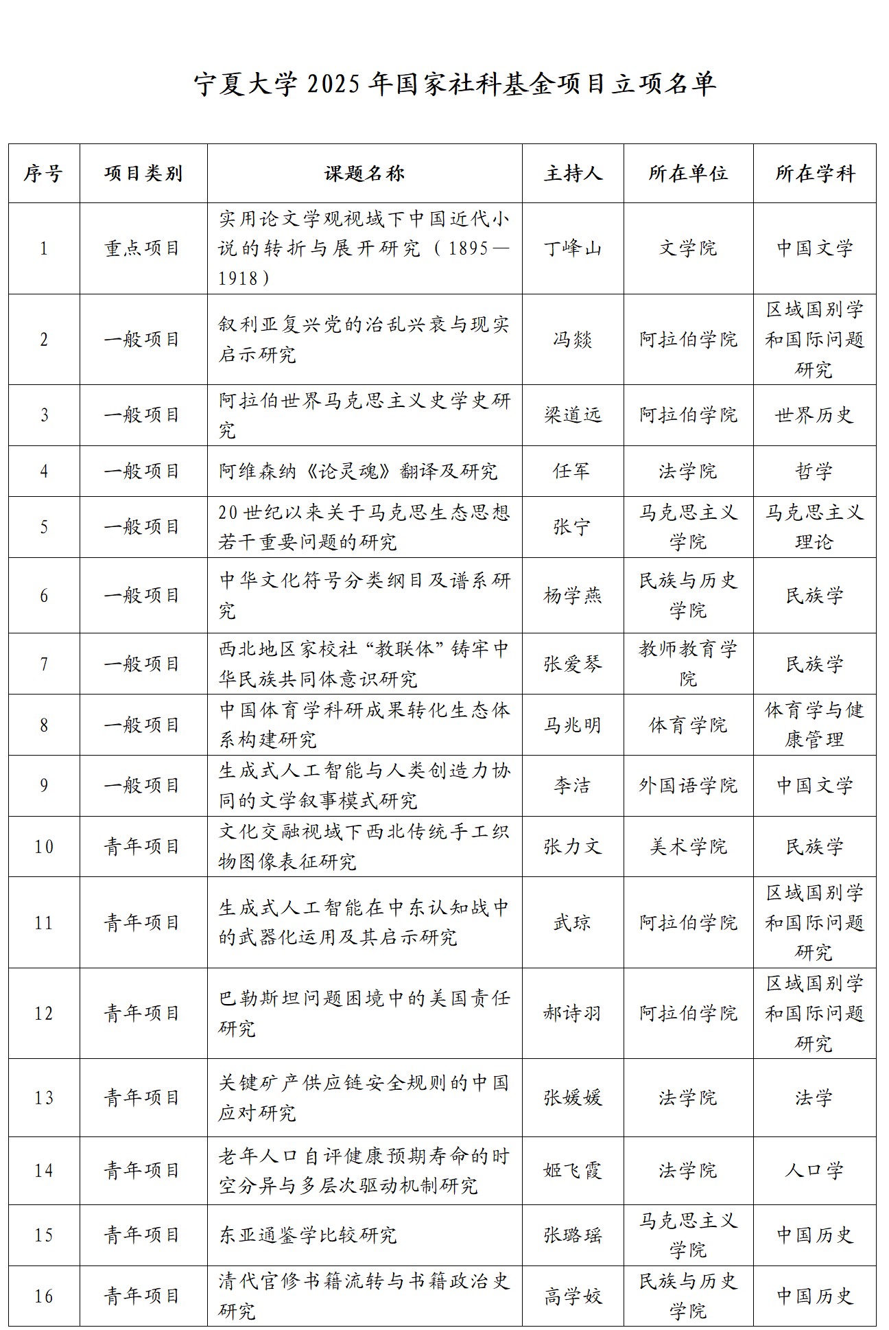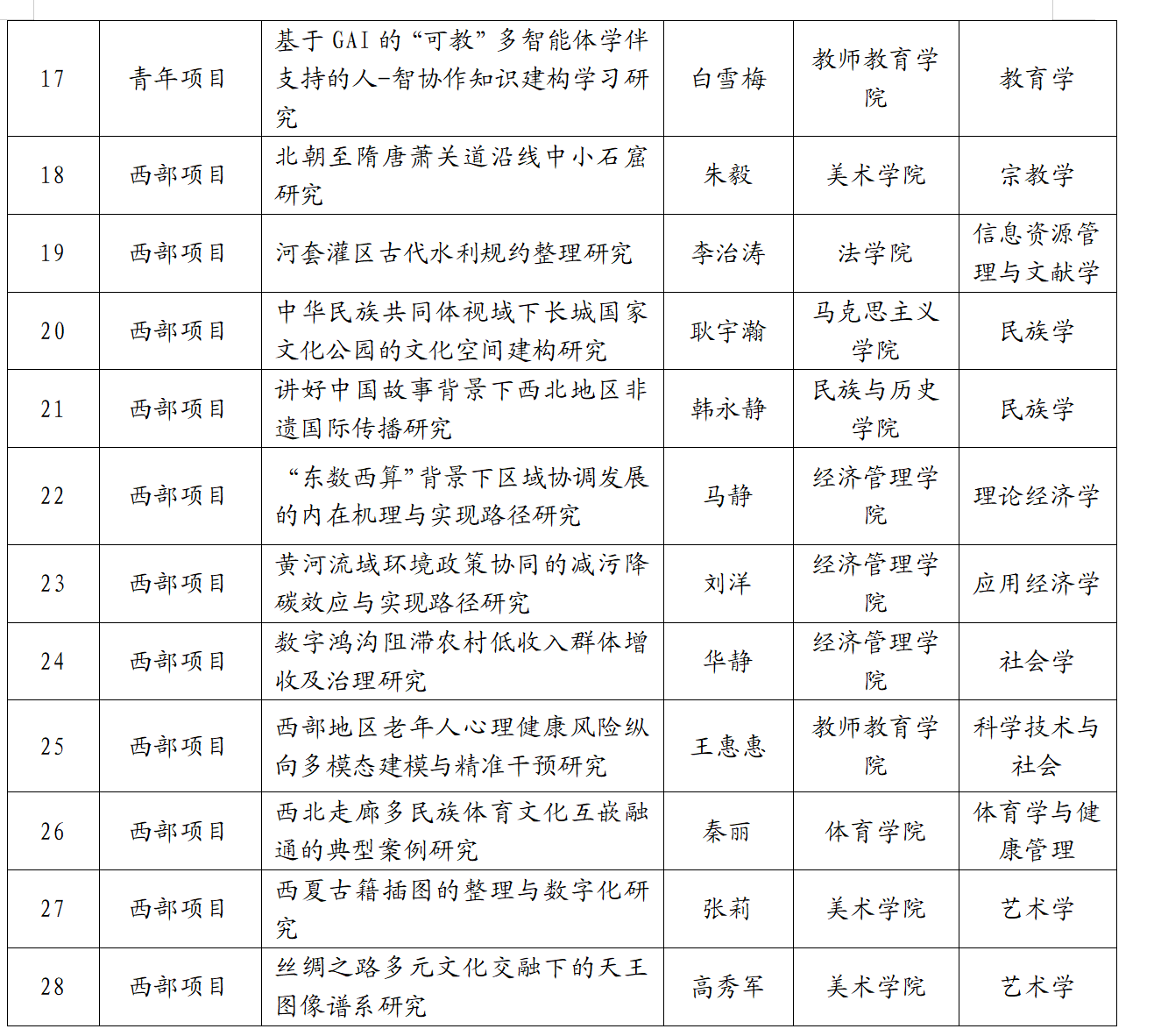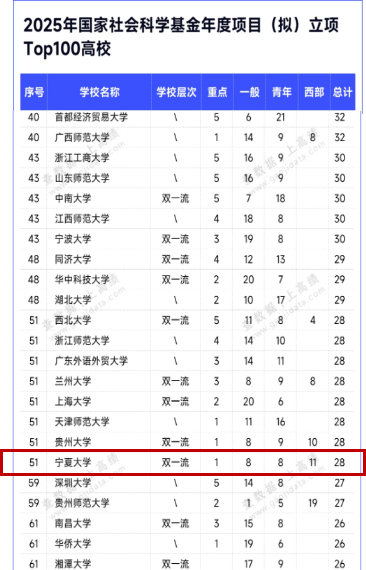 【宁夏大学新闻中心讯 人文社会科学处】近日,2025年国家社科基金教育学、艺术学和年度项目立项结果先后正式公布,我校共有28个项目获得立项资助(其中重点项目1项、一般项目8项、青年项目8项、西部项目11项),约占全区立项总数的55%,位列Z14高校国家社科基金立项排名第4位,在全国国家社科基金项目立项排名中位列第51位,是“十四五”期间我校国家社科基金项目立项最好成绩。目前,仍有部分国家社科基金项目正在组织申报或评审中。