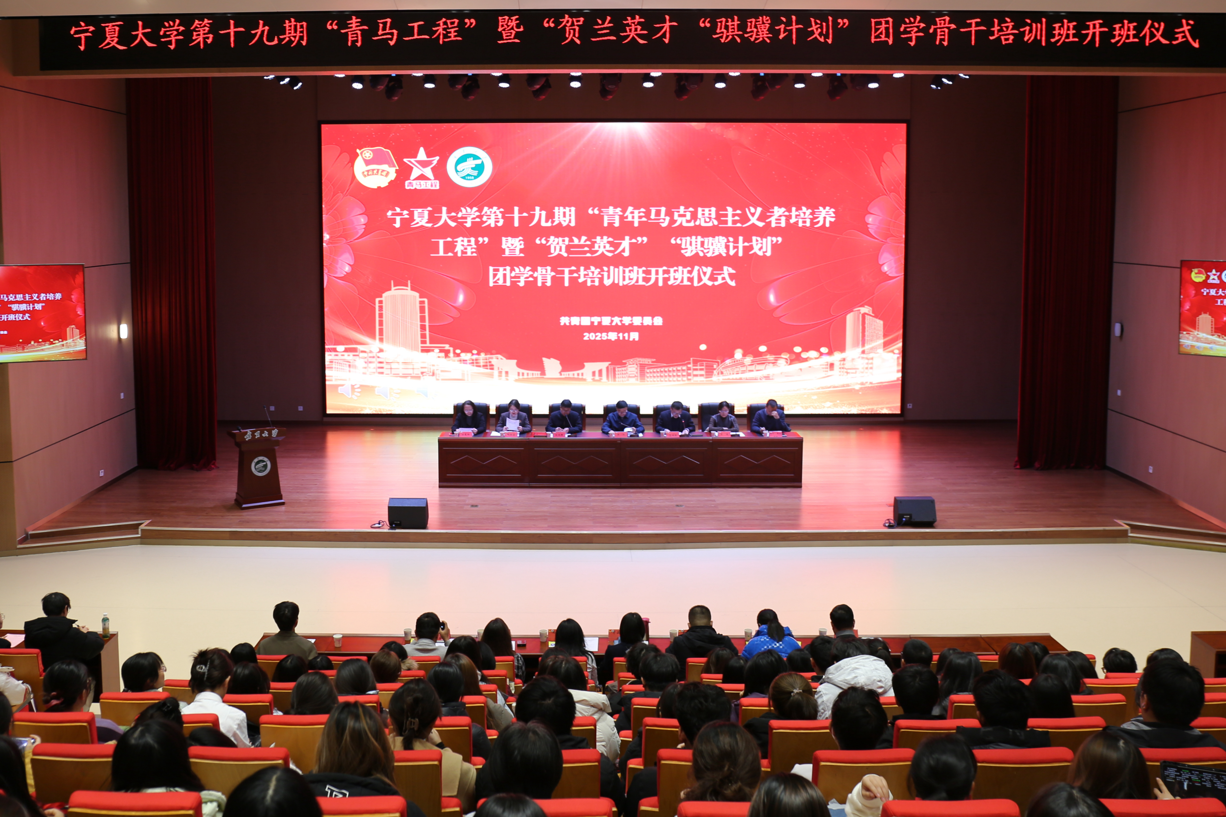 党委组织部、党委宣传部、党委统战部、党委学生工作部、团委、国际教育学院相关工作负责人参加开班仪式。校团委各部门工作人员,各团委书记、副书记、团组织负责人,“青马工程”“贺兰英才”“骐骥计划”培训班学员、2025级团支部书记400余人参加开班仪式。