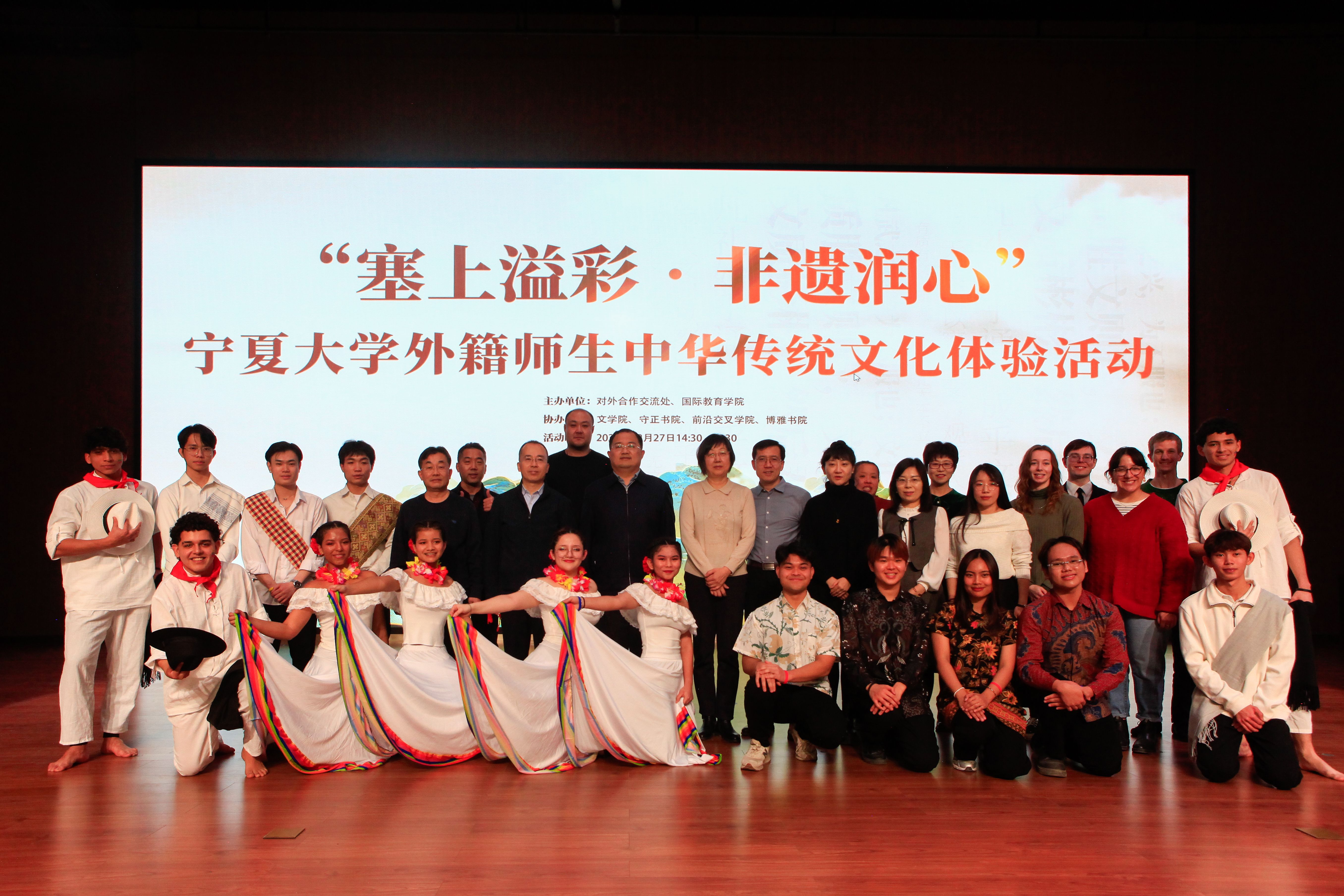 【宁夏大学新闻中心讯 杨雯/文 杨雯 学生记者 田慧文 李紫东/图】12月27日下午,“塞上溢彩 非遗润心”外籍师生中华传统文化体验活动在贺兰山校区笃行楼三楼报告厅举办,280多名外籍师生共同感受中华传统文化的魅力,开启了一场别开生面的文化感知与交流之旅。活动由对外合作交流处、国际教育学院主办,守正书院、博雅书院、前沿交叉学院协办,校党委副书记韩惠丽,校党委常委、副校长杨文法参加活动。
