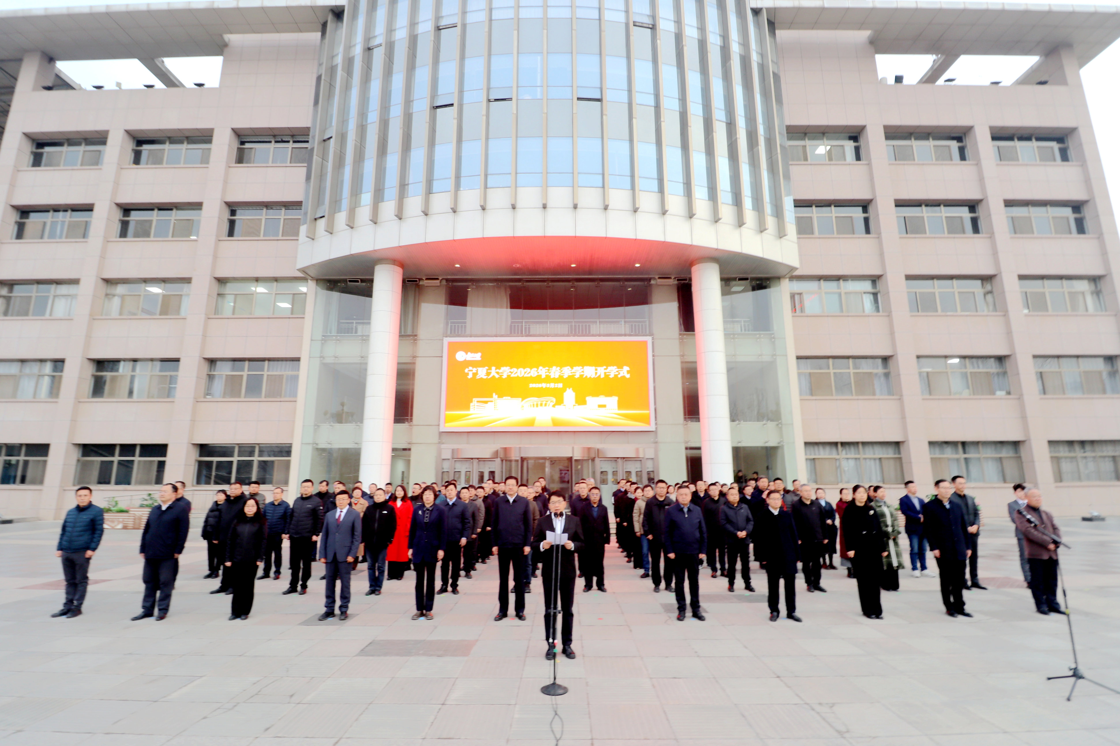 【宁夏大学新闻中心讯 王文娣/文 张景 李明花/图】3月2日清晨,我校在贺兰山校区德勤楼前举行2026年春季学期开学式。全体校领导参加活动,校党委副书记、校长彭志科主持仪式。