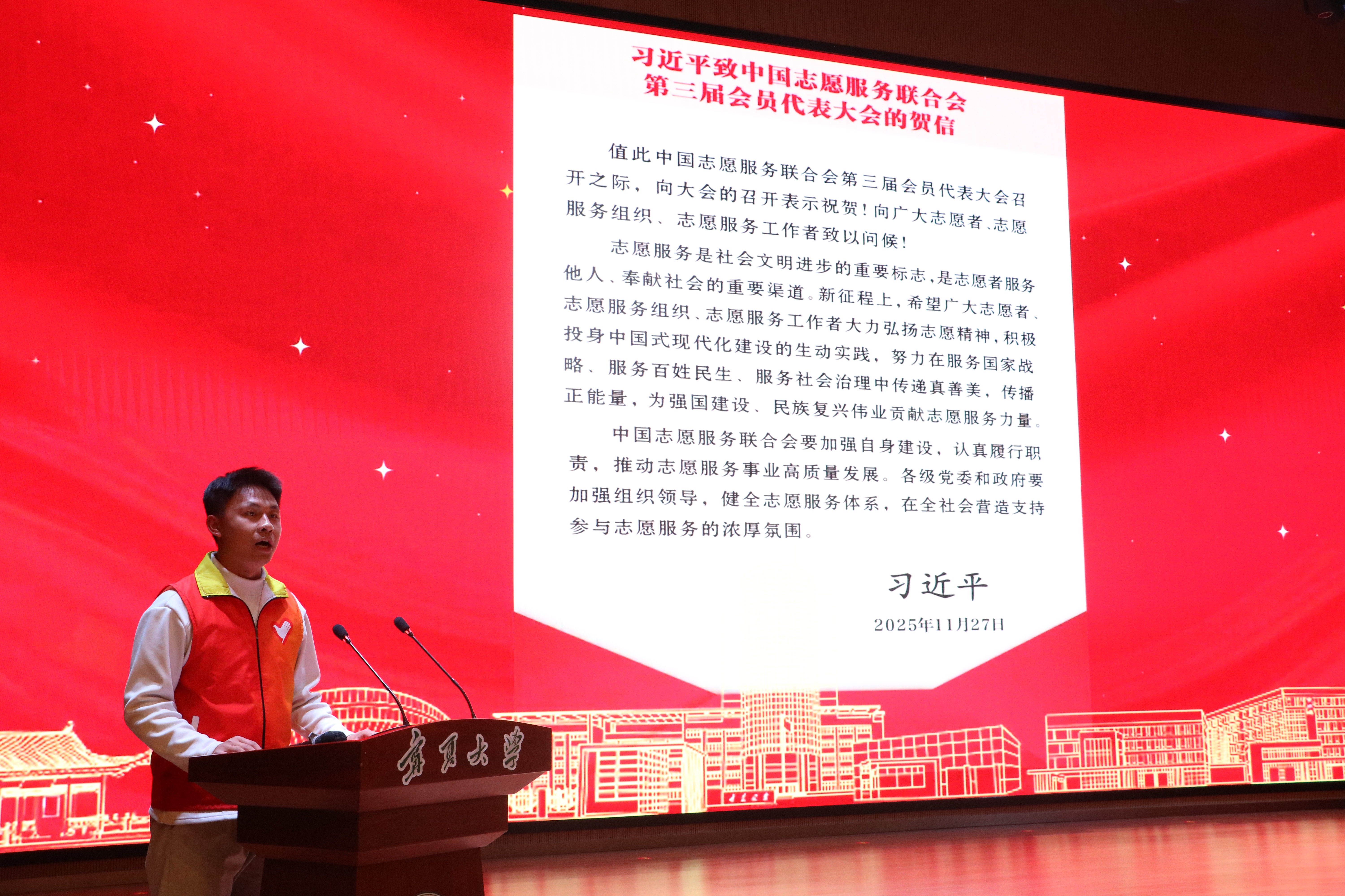 黄河表示,在“十五五”规划开局起步的关键节点,弘扬雷锋精神是践行社会主义核心价值观的实践,更是高校立德树人的必然要求。回望学校志愿服务的坚实足迹,一代代宁大学子以“沙枣树精神”践行雷锋精神,在志愿服务中交出亮眼答卷,让学雷锋成为融入国家发展、融入民族复兴的生动体现。他指出,青年志愿者要坚守初心,自觉用习近平新时代中国特色社会主义思想武装头脑,将学雷锋与校风学风建设深度融合,让志愿精神成为宁大青年的共同追求,让听党话、跟党走成为青春最鲜明的底色。他希望青年志愿者要深耕实践,立足学校学科专业特色,紧扣“十五五”时期国家重大战略和宁夏发展需求,推动志愿服务与乡村振兴、生态保护、社会治理等深度对接,做到学以致用、知行合一。他号召青年志愿者要挺膺担当,把学雷锋活动融入日常、化作经常,将“沙枣树精神”与雷锋精神深度融合,在服务宁夏经济社会发展、助力西部大开发新格局中展现宁大青年的硬核担当。