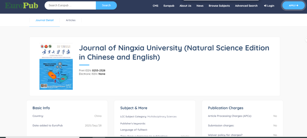 【宁夏大学新闻中心讯 学术期刊中心】近日,由宁夏大学主办的《宁夏大学学报(自然科学版中英文)》《西北工程技术学报(中英文)》和《农业科学研究(中英文)》期刊,正式被国际知名学术数据库EuroPub收录。此次入选是期刊发展历程中的一个重要里程碑,标志着我校主办的学术期刊在自然科学、工程技术及农业科学领域的研究成果与办刊质量获得了国际认可,对提升我校学术影响力、推动国际化学术交流具有重要意义。