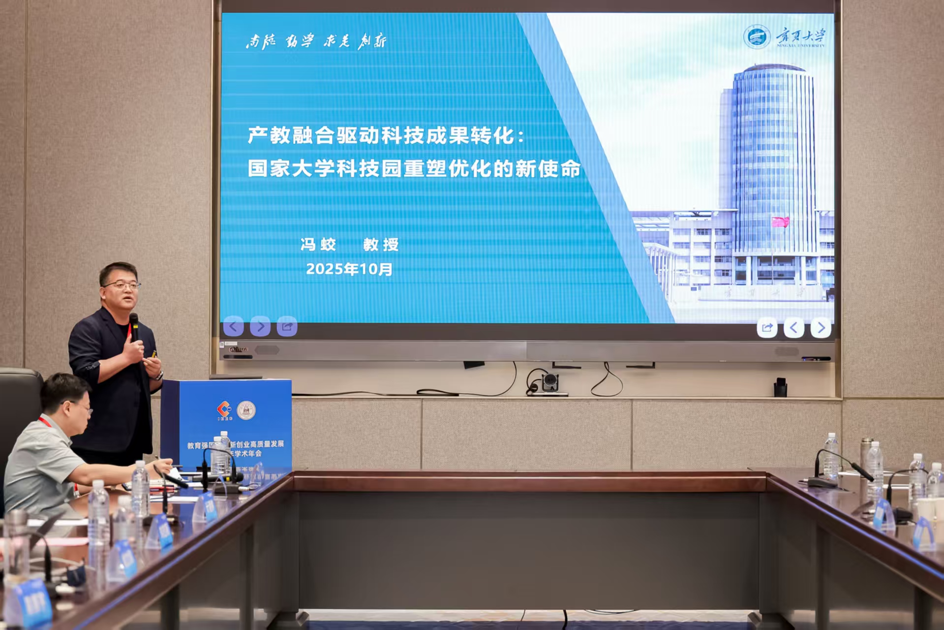 在大会产教融合学术交流活动上,冯蛟发表主题演讲《产教融合驱动科技成果转化:国家大学科技园重塑优化的新使命》。