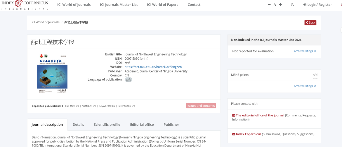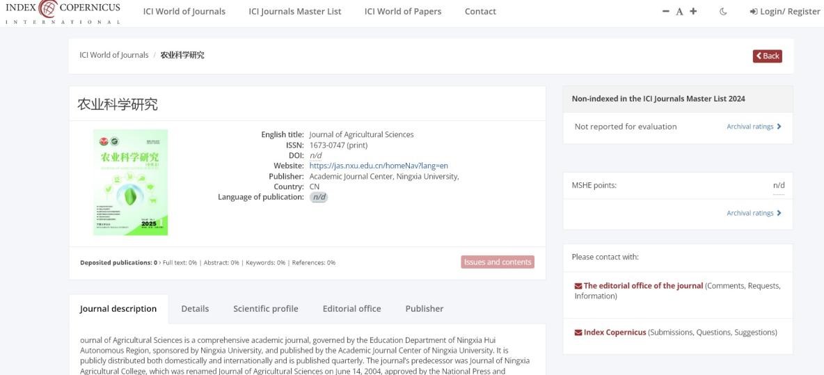 【宁夏大学新闻中心讯 学术期刊中心】近日,由宁夏大学主办的《宁夏大学学报(自然科学版中英文)》《西北工程技术学报(中英文)》《农业科学研究(中英文)》期刊,正式被ICI World of Journals(波兰哥白尼期刊数据库)收录。此次入选,标志着三种期刊的学术质量与国际影响力再次获得了国际重要检索系统的认可,是我校学术期刊走向国际化进程中的又一重要里程碑。