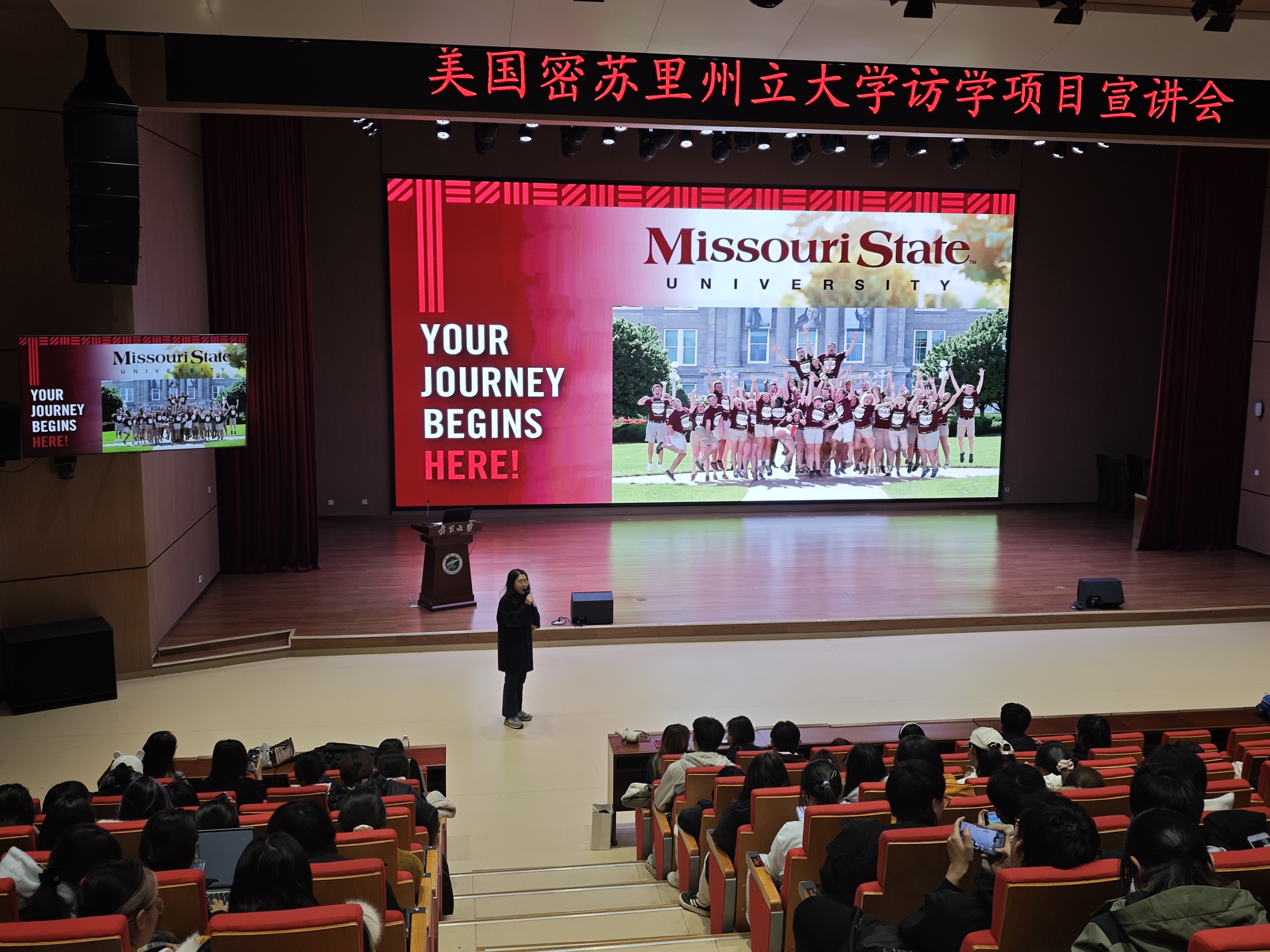 【宁夏大学新闻中心讯 对外合作交流处】11月25日,由对外合作交流处主办的美国密苏里州立大学访学项目宣讲会在笃行楼一楼报告厅举办,宣讲会特邀美国密苏里州立大学国际领导力培训中心负责人范巾子老师、Kevin James老师作为主讲嘉宾,来自守正书院、尚德书院、勤学书院、润泽书院的近300名同学到场聆听。