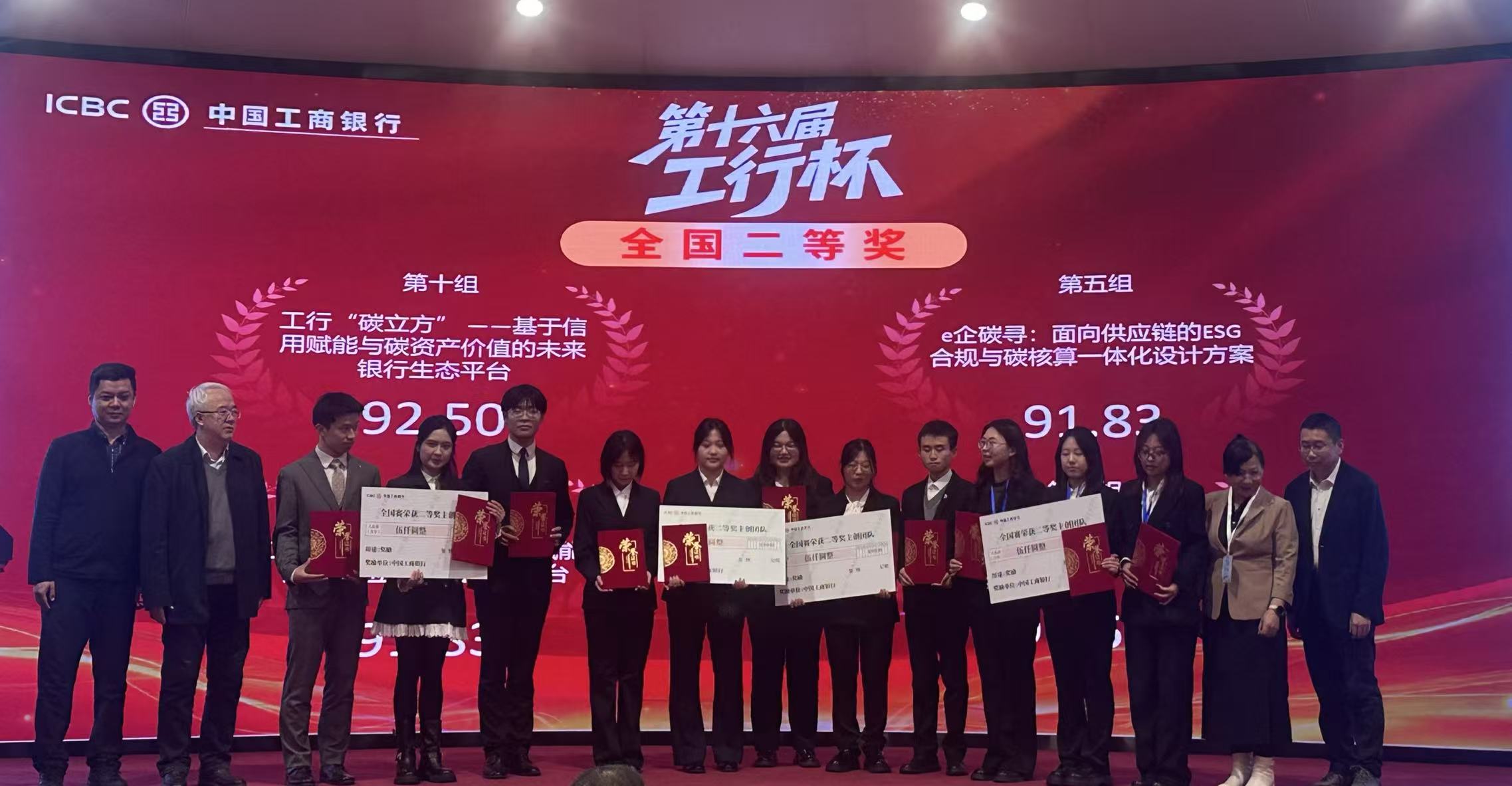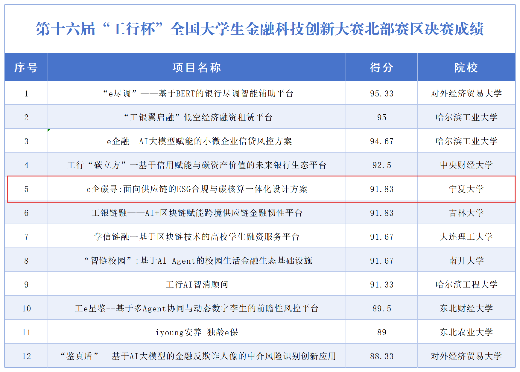 【宁夏大学新闻中心讯 创新创业学院】11月27日,第十六届“工行杯”全国大学生金融科技创新大赛北部赛区决赛在哈尔滨工业大学举行。来自中央财经大学、对外经济贸易大学、南开大学、吉林大学等知名高校的12支队伍同台竞技,我校冯蛟、全晓虎、刘淑萍、薛新耀教师共同指导,吕萃彦、马建斌同学担任负责人的《e企碳寻——面向供应链的ESG合规与碳核算一体化设计方案》项目在强手云集的决赛中脱颖而出,荣获全国二等奖,展现了宁大学子在金融科技创新领域的优秀实力。