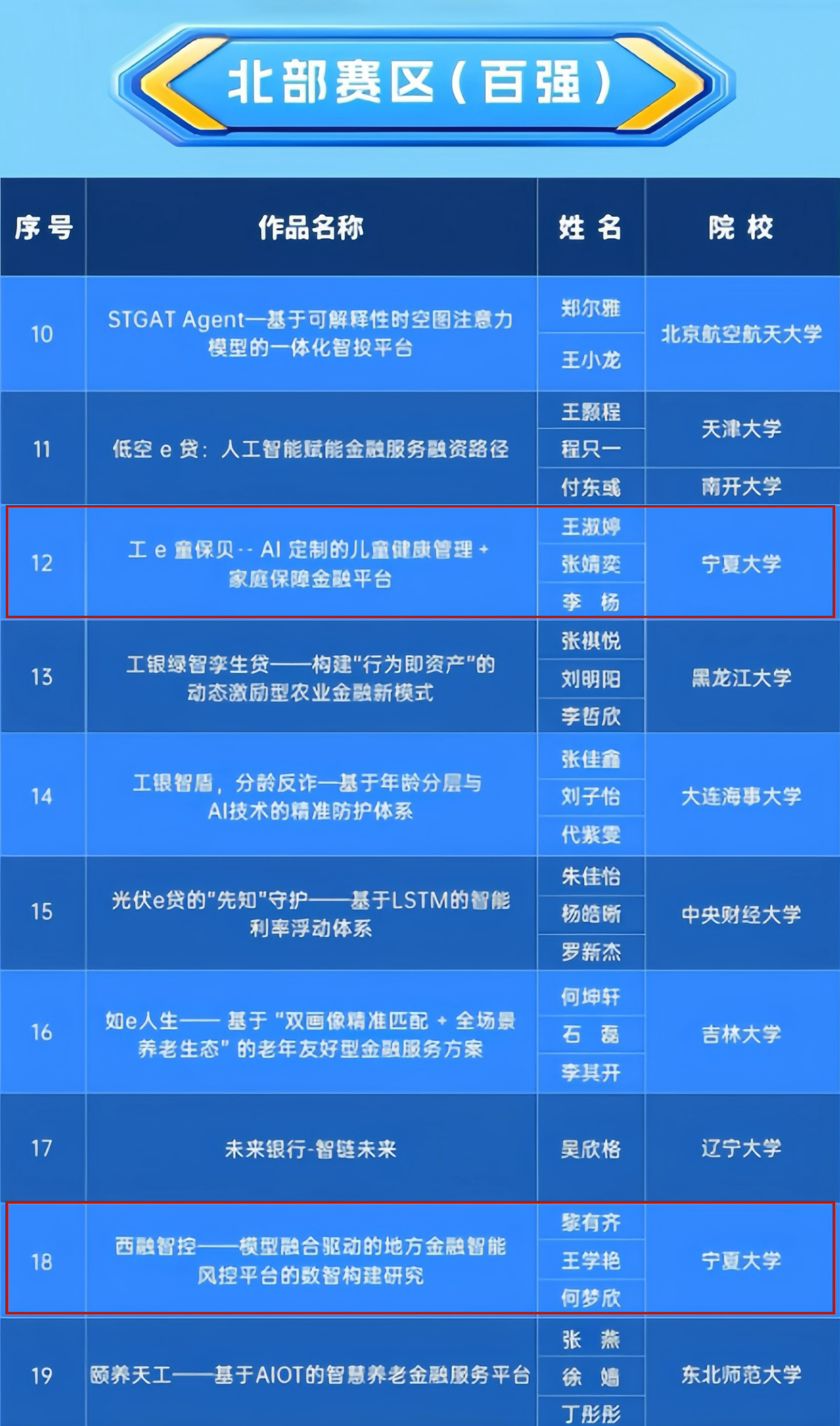 此外,由赵军老师指导,黎有齐、王学艳、何梦欣同学负责的项目《西融智控——模型融合驱动下的地方金融智能风控平台构建研究》,与由薛新耀、陈瑾老师指导,王淑婷、张婧奕、李杨同学负责的项目《工e童保贝——AI定制的儿童健康管理+家庭保障金融平台》,成功入围全国百强名单并获得全国优秀奖,为我校在本届大赛中的整体表现再添佳绩。