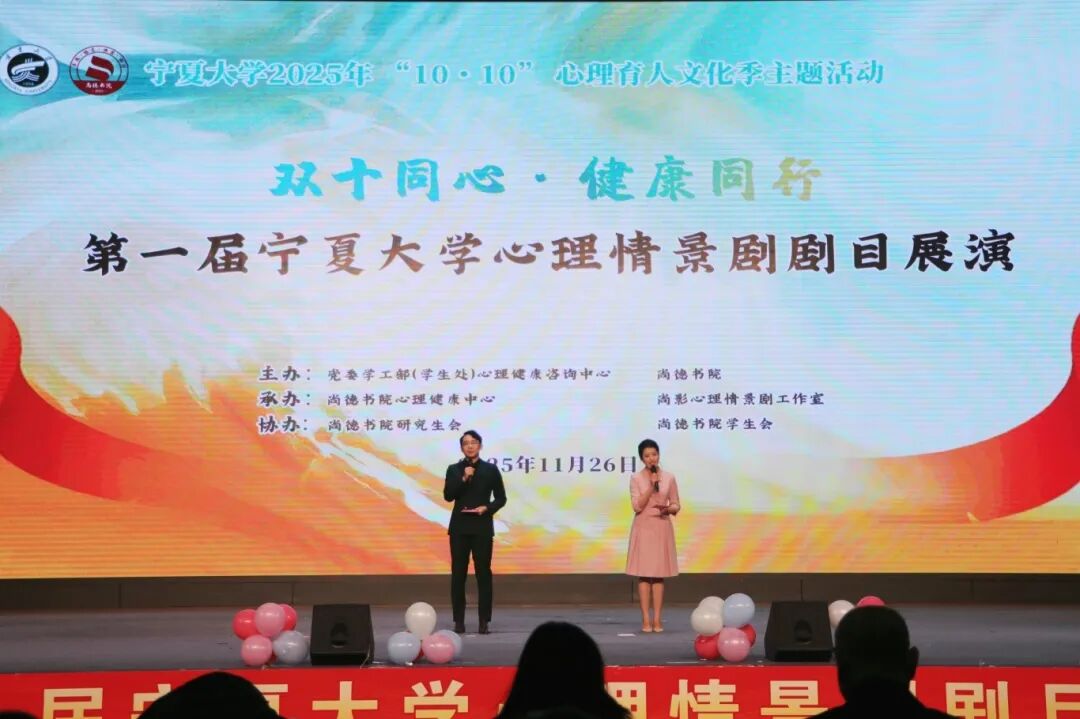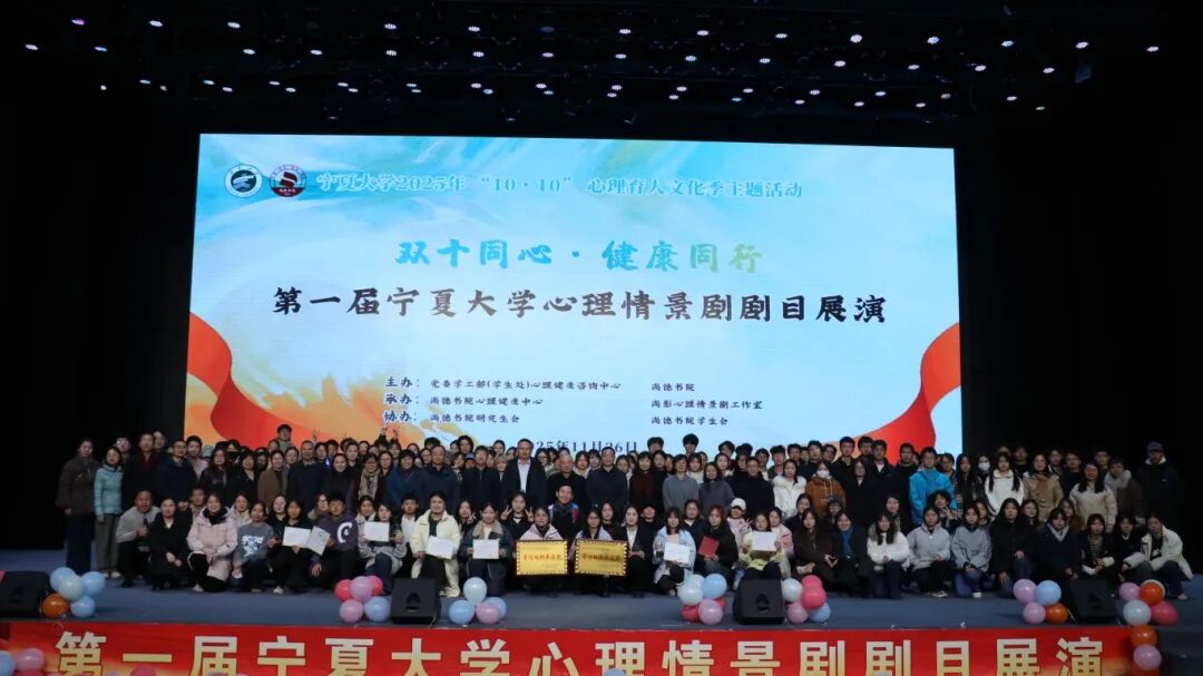【宁夏大学新闻中心讯 党委学生工作部】我校2025年“10·10”心理育人文化季期间,为丰富心理育人载体,营造积极健康的校园氛围,11月26日,由宁夏大学学生心理健康咨询中心主办的宁夏大学第一届心理情景剧剧目展演在文萃校区大学生活动中心启幕。自治区教育厅学生处、宁夏医科大学、宁夏师范大学、北方民族大学、宁夏工商职业技术大学、宁夏工业职业学院、银川能源学院等高校相关部门领导出席活动,7位宁夏高校心理专家担任评委,各书院近2000名师生齐聚,共赴这场心灵之约。