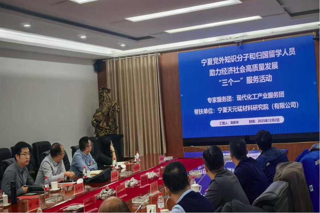 【宁夏大学新闻中心讯 党委统战部】12月2日,我校党外知识分子和归国留学人员“三个一”现代化工产业服务团副团长高新华,携化学化工学院院长张鹏飞、副院长彭娟、长江学者王英龙等专家及服务团成员一行十余人赴帮扶单位宁夏天元锰业集团有限公司,开展精准调研与专项帮扶活动,宁夏天元锰业集团有限公司总裁王旭飞、党委书记刘天华、首席工程师沈天海及相关部门负责人、技术骨干参加座谈。