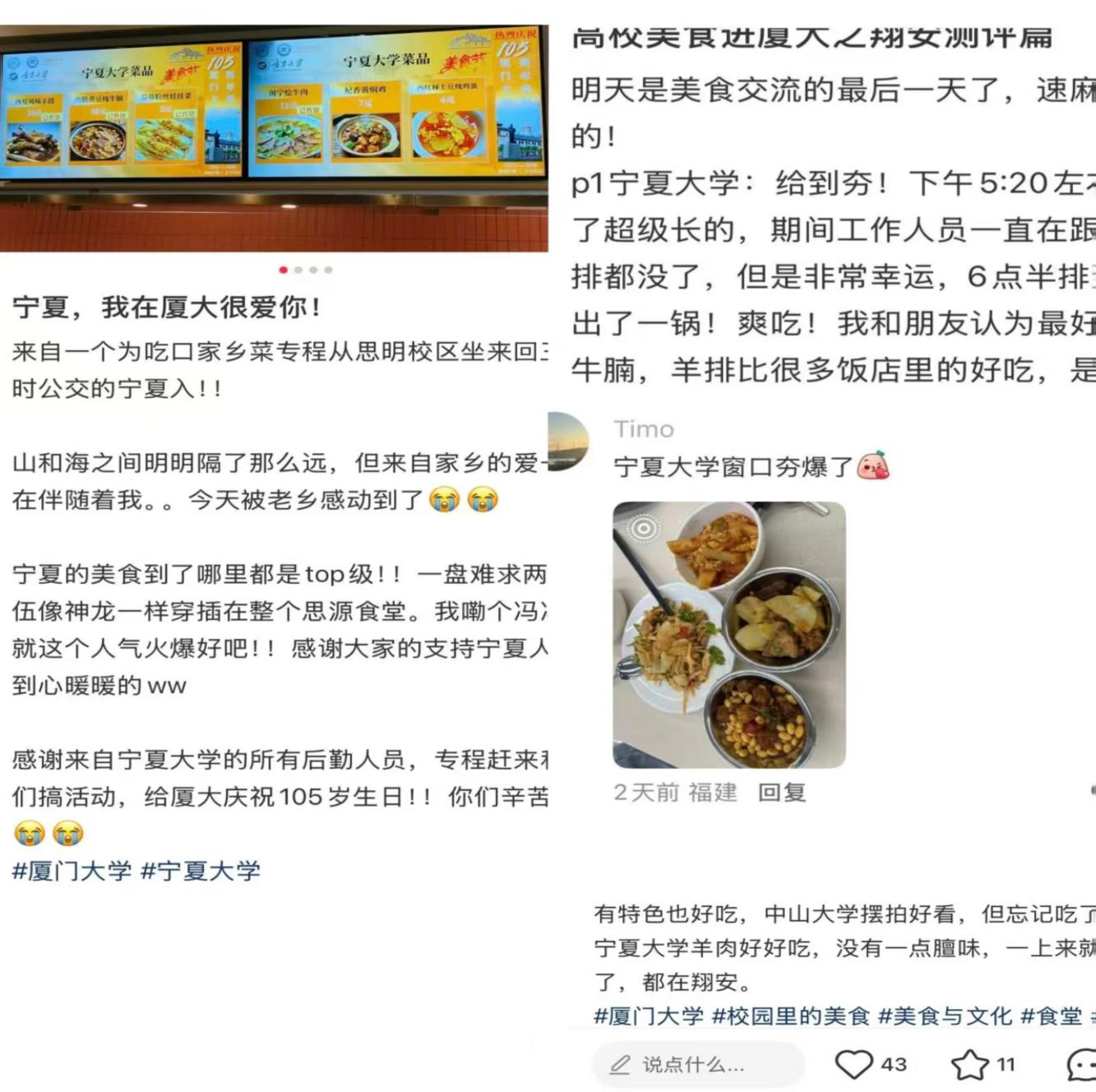 在本次交流活动中,我校美食凭借独特风味在厦大校园迅速“圈粉”,吸引了今日头条、宁夏日报、银川晚报、厦门大学新闻网等多家主流媒体的关注与报道。厦大的同学们也纷纷在抖音、小红书等社交平台上发布图文并茂的好评帖子,分享品尝宁夏美食的惊喜体验。