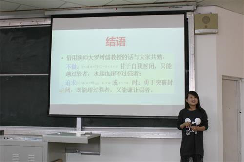 会上,2013级数学与应用数学(师范)学生代表从自己的亲身经历,存在问题和实习感悟出发,与同学们分享了自己在实习工作任务中的经验。