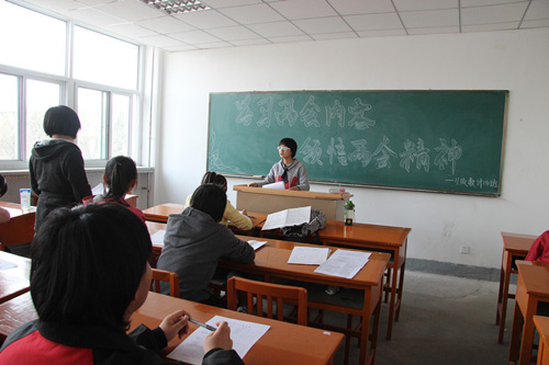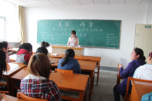 【宁夏大学新闻中心讯 数学计算机学院 乔楠:文/张鹏:图】为增强学生关心时政的兴趣,培养自己与国家同命运的意识,提高自身政治修养,数学计算机学院团委结合当下“两会”(第十一届全国人民代表大会第五次会议和政协第十一届全国委员会第五次会议)热潮,于2012年3月14日下午组织2010、2011级14个教学班开展了“学习两会”主题班会活动。
