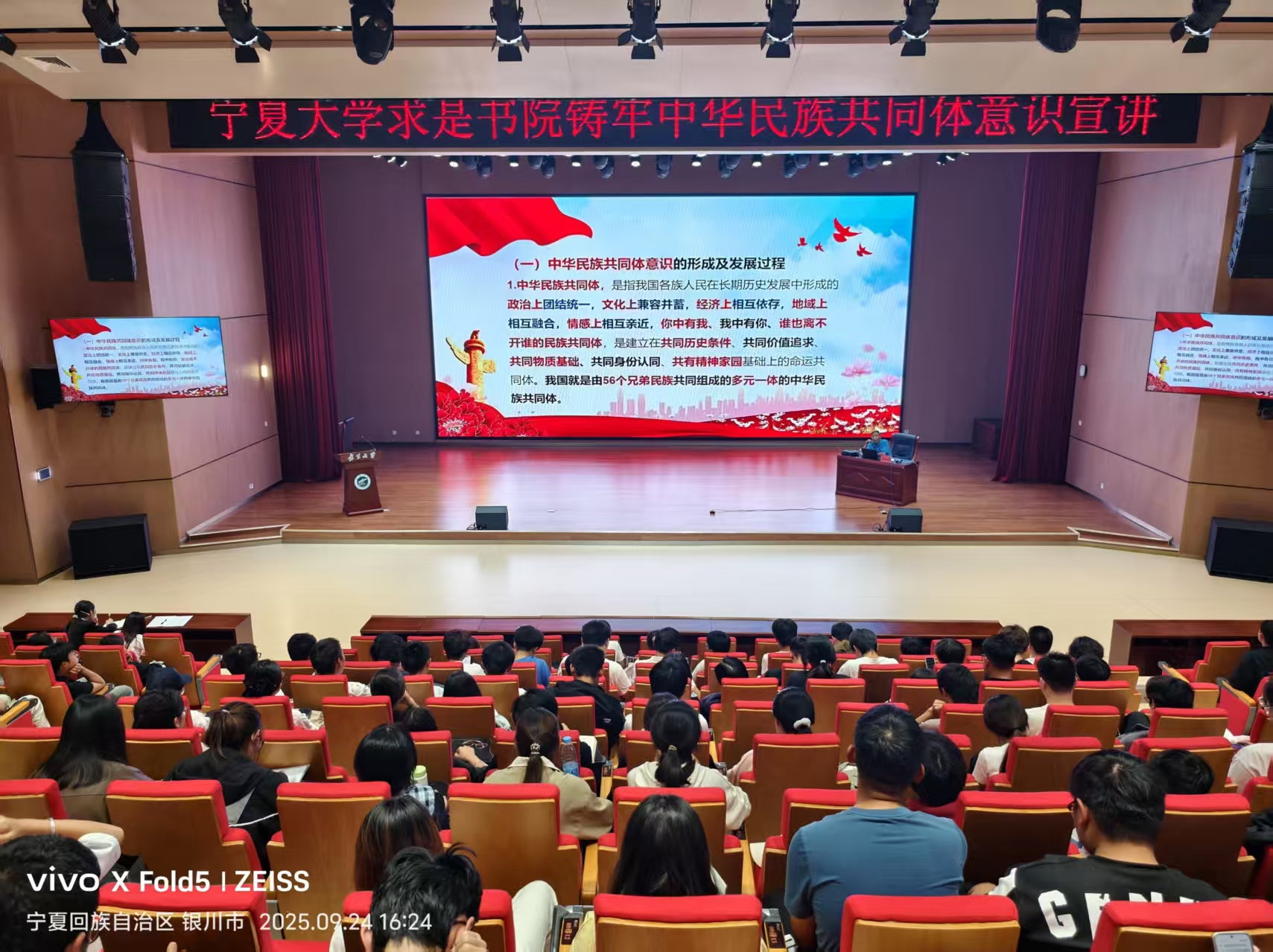 【宁夏大学新闻中心讯 求是书院】为深入贯彻落实习近平总书记关于加强和改进民族工作的重要思想,切实加强铸牢中华民族共同体意识宣传教育,9月24日下午,求是书院在贺兰山校区笃行楼一楼报告厅举行铸牢中华民族共同体意识宣讲。学校苏东海教授为书院三百余名学生作了题为“铸牢中华民族共同体意识,为实现中华民族伟大复兴汇聚磅礴力量”的宣讲报告。