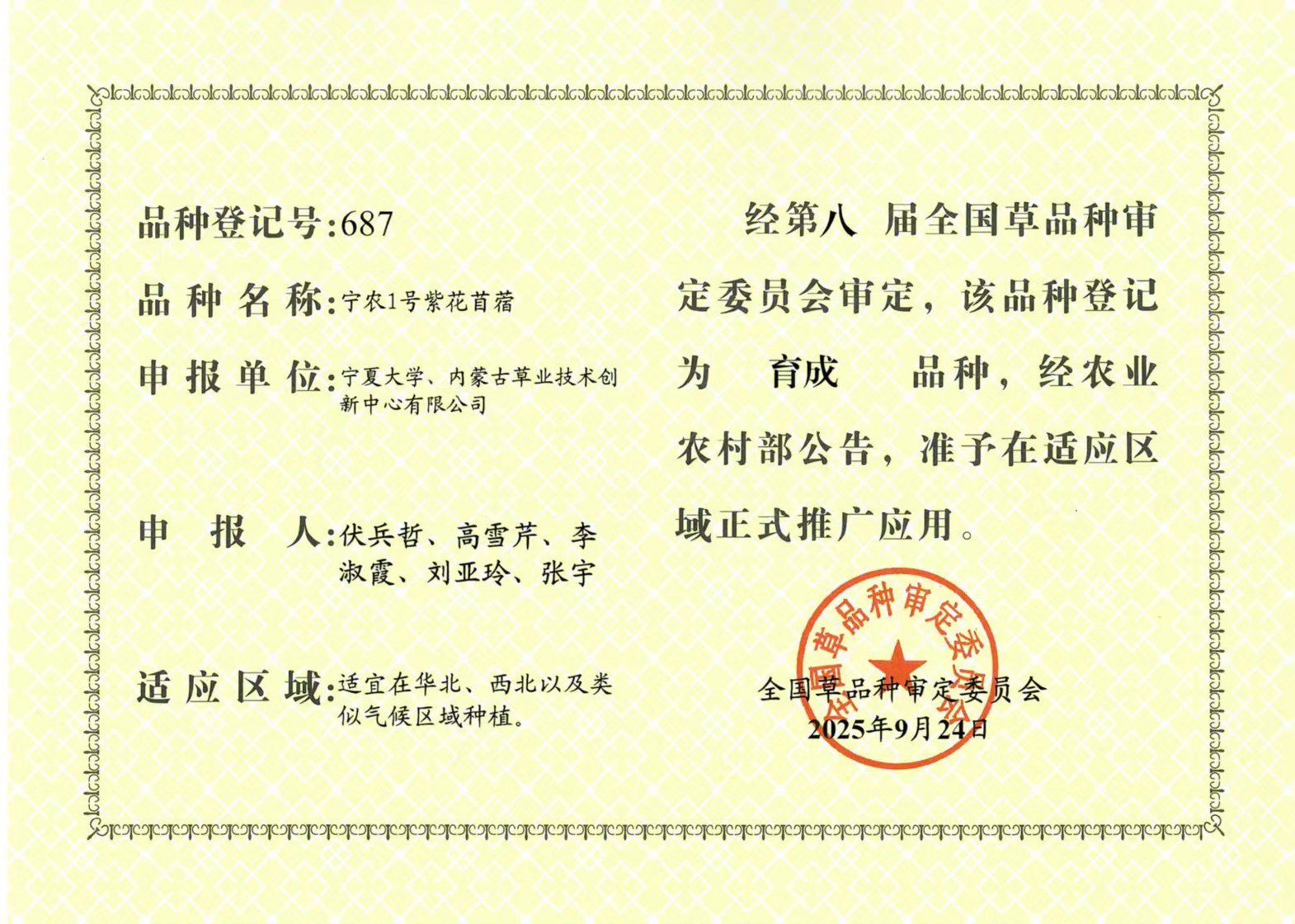 “宁农1号”紫花苜蓿新品种历经多年系统选育,具备产量高、抗旱性强、营养丰富等优良特性,尤其适宜在西北、华北等干旱、半干旱地区推广种植。该品种通过此次国家审定,标志着其适应性、生产性能与营养价值均获权威认可,将为区域饲草产能提升和草畜产业高质量发展提供有力品种支撑。