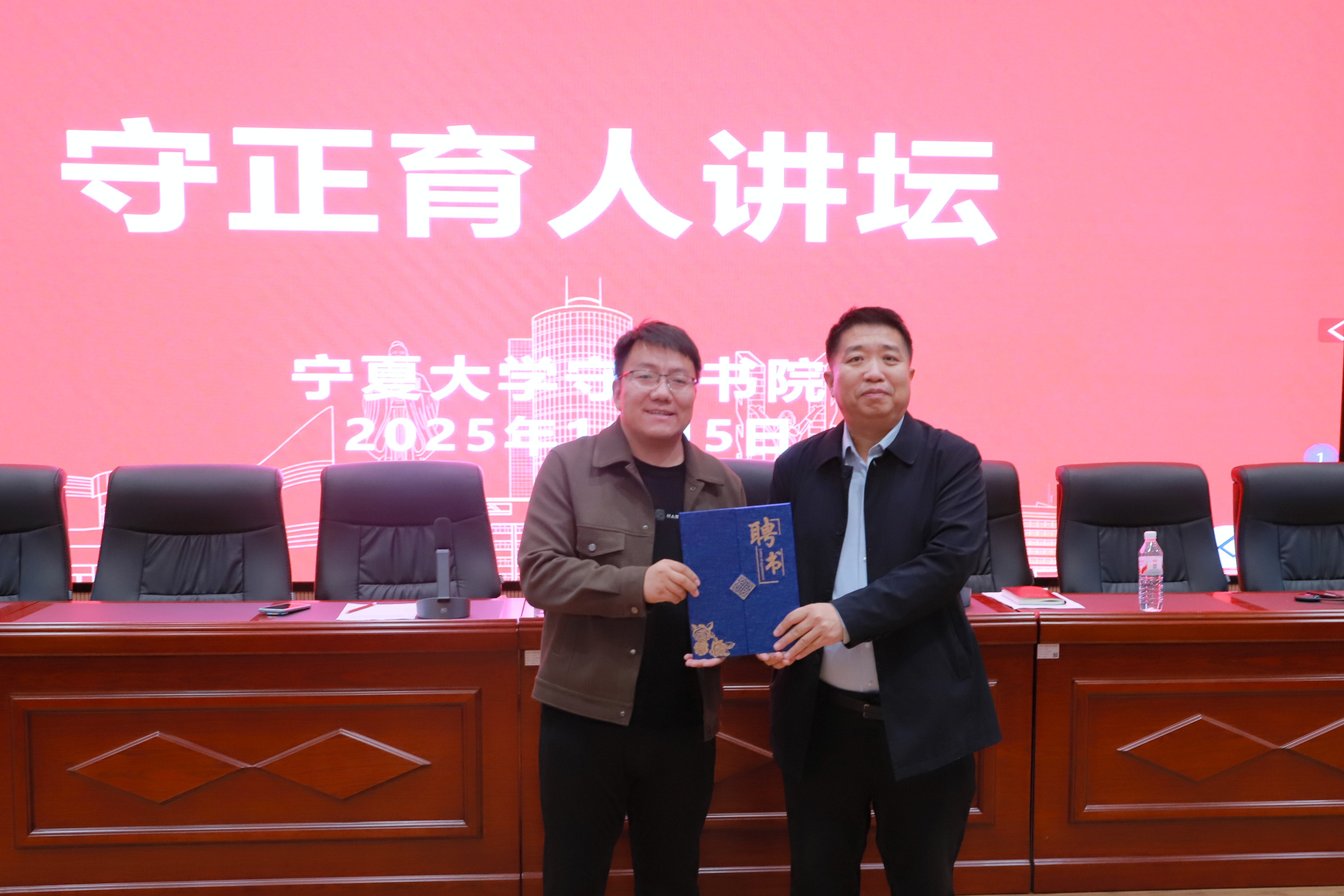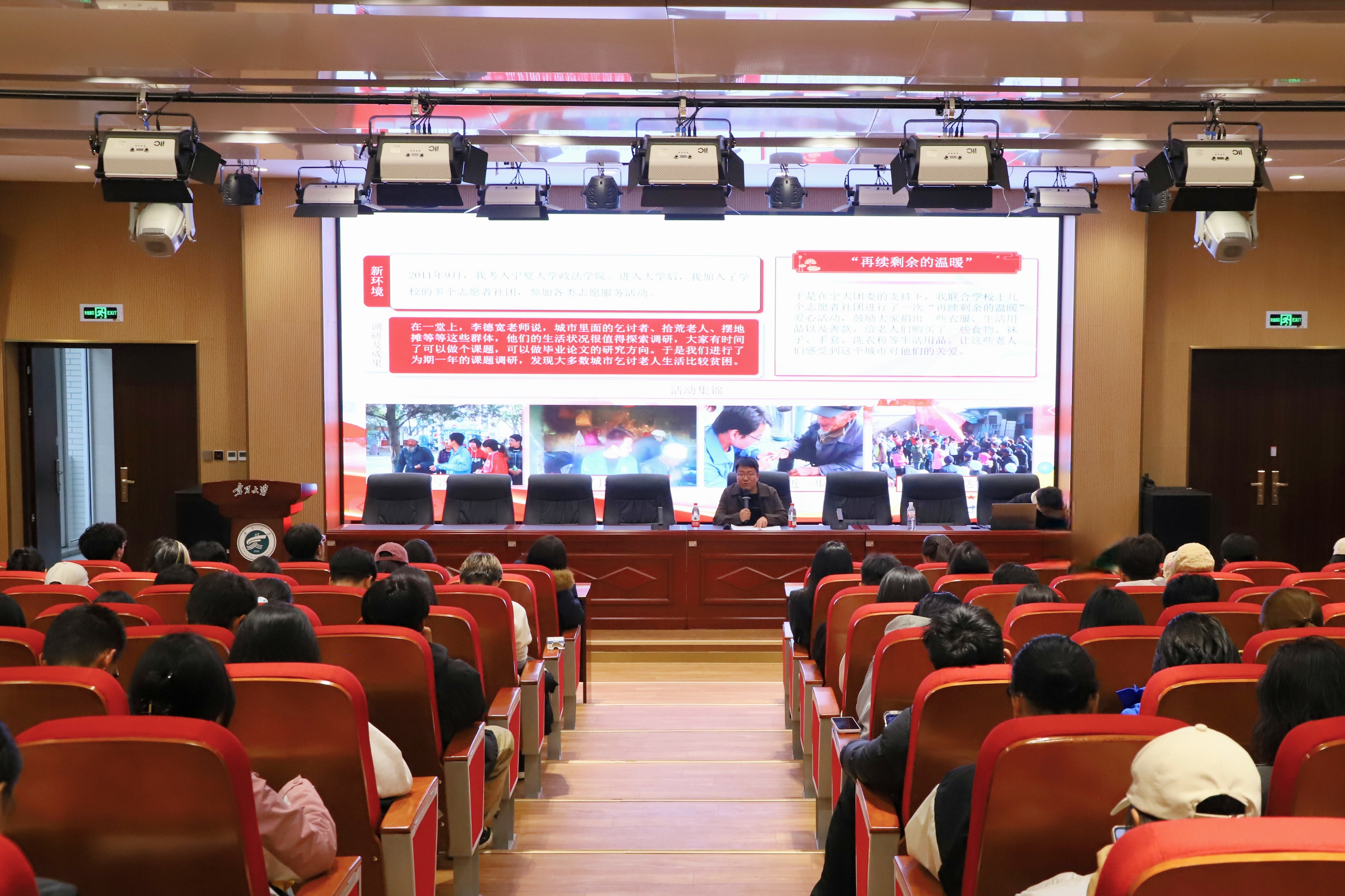 【宁夏大学新闻中心讯 守正书院】11月5日下午,守正书院于怀远楼二楼报告厅举办了“守正育人讲坛”(第七讲)。此次讲座邀请到我校2011级校友、宁夏微光义工志愿者服务总队队长、“全国向上向善好青年”、宁夏青年五四奖章、第九届全国道德模范提名奖获得者杨小明,以 “用‘微光’传递爱心”为主题,带来了一场饱含温暖与力量的专题讲座。守正书院党委副书记赵永军、党建思政中心马晓娜老师、“领航”工程教师党员、“领雁”工程学生党员及各年级学生代表200余人参加。
