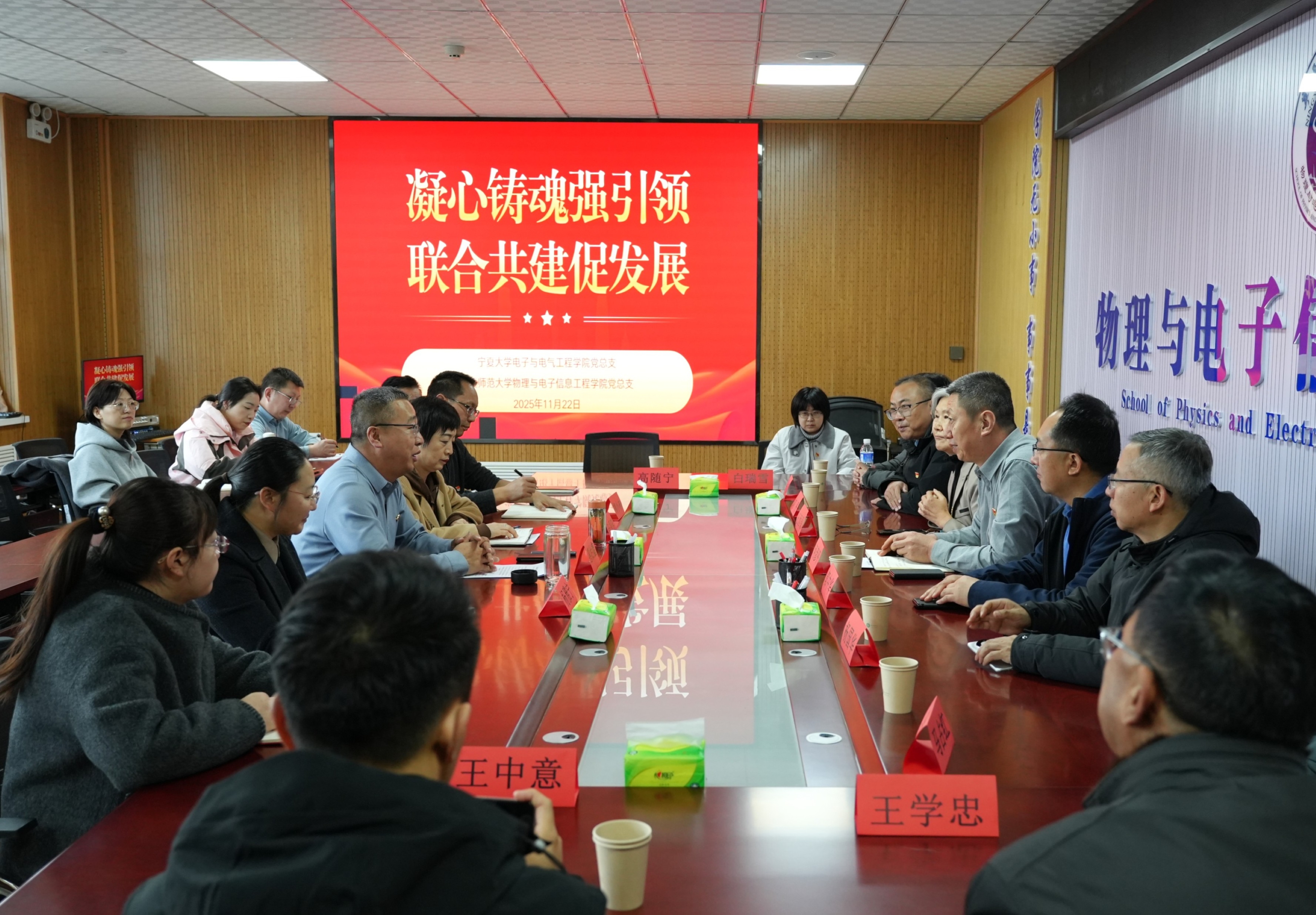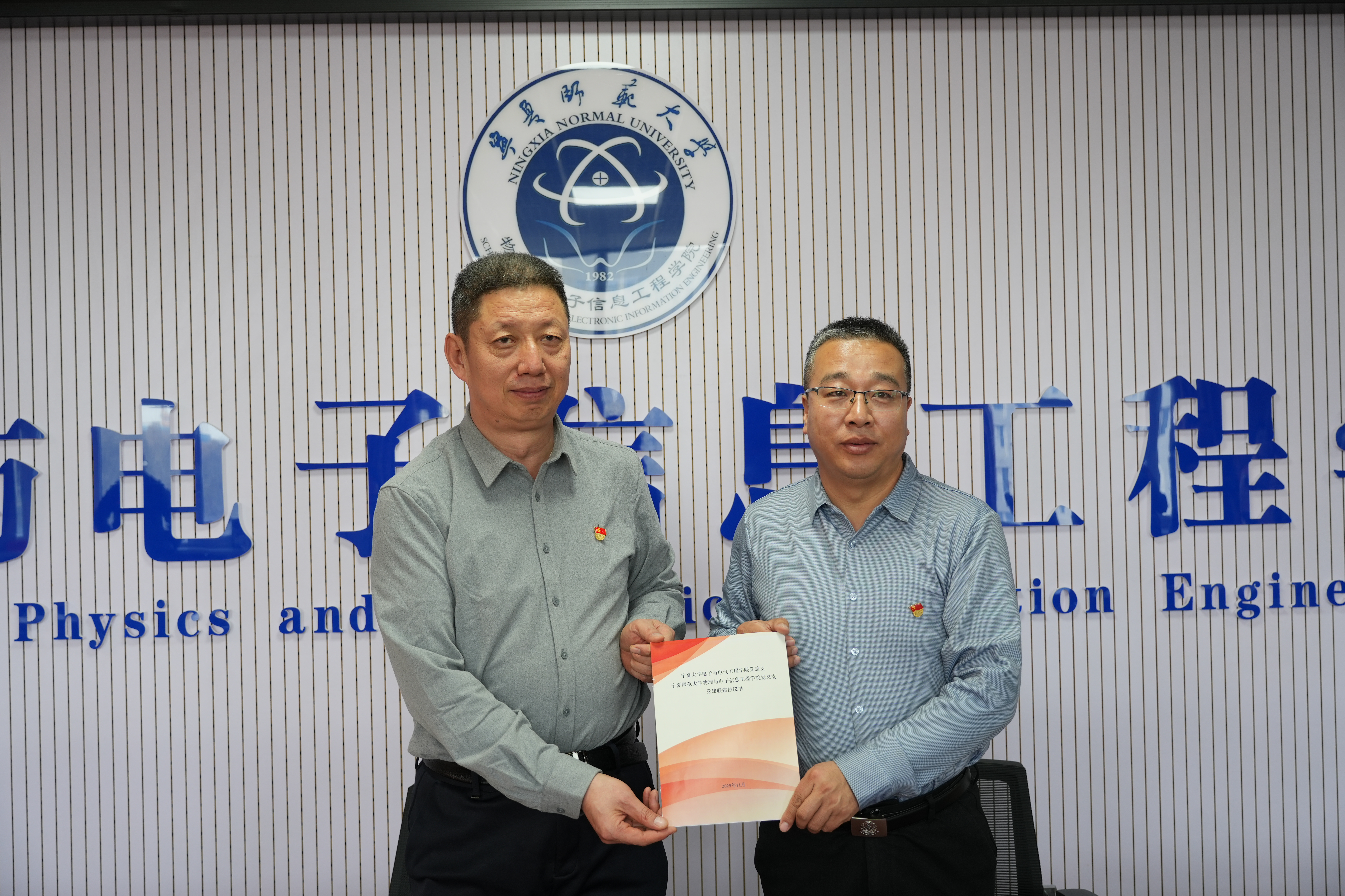 22日,学院一行前往宁夏师范大学物理与电子信息工程学院,共同开展“凝心铸魂强引领 联合共建促发展”党建联建活动。参观了宁夏师范大学先进的专业实验室以及底蕴深厚的校史馆,深入了解了其在学科建设、实验教学方面的先进经验。座谈会上,两院党组织负责人分别介绍了学院党建工作开展情况及成效,双方围绕“高质量党建引领高质量发展”主题,就学科建设、人才培养、科学研究等议题进行了深入交流与探讨。何彦平与宁夏师范大学物理与电子信息工程学院党总支副书记、院长惠治鑫共同签署了党建联建协议书,标志着两院在党建资源共享、业务协同发展等方面开启新篇章,共谋新发展。