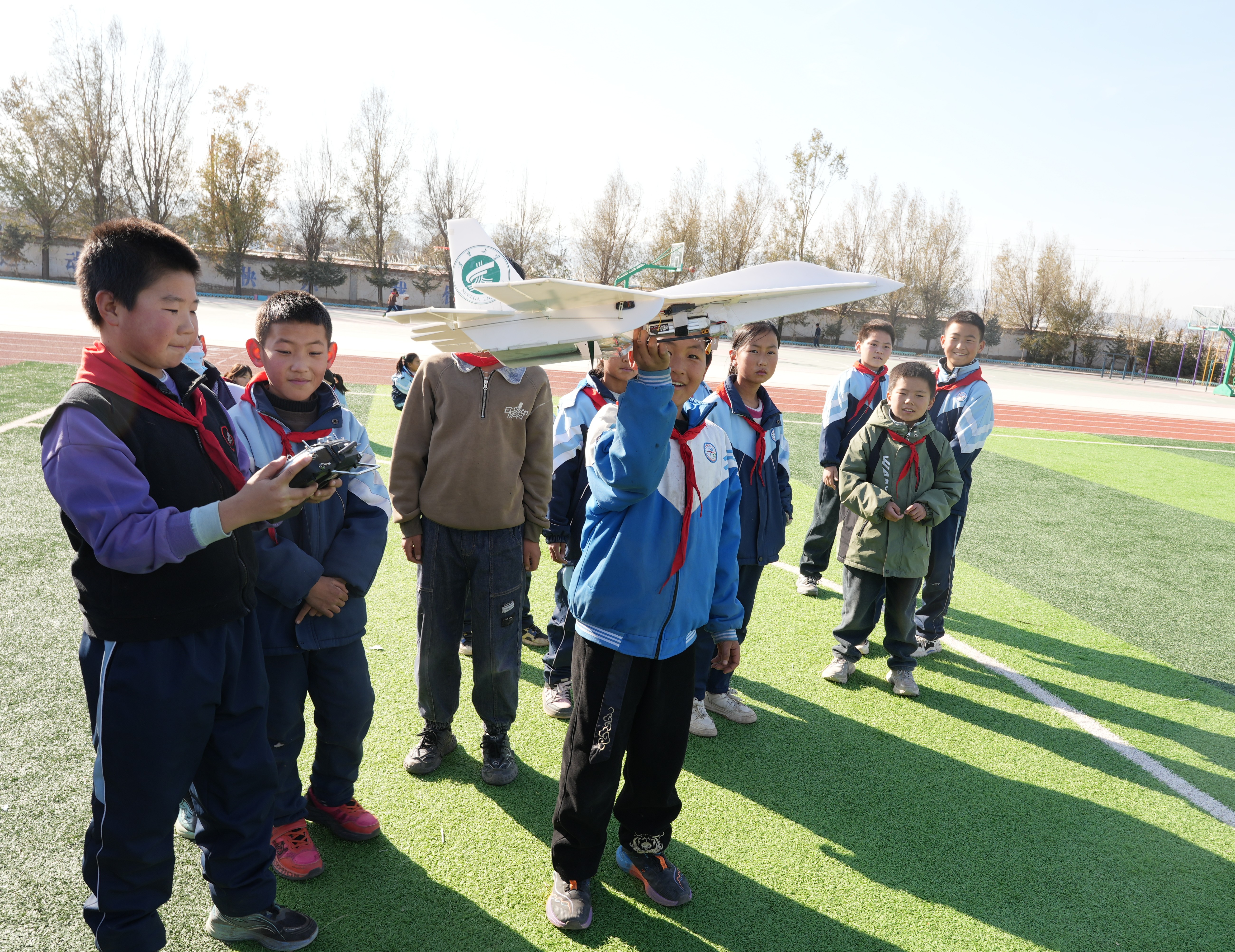 活动中,学院与马庄小学联合举办了“深耕教育服务 笃行实践育人 携手奋进强国行”主题教育活动,学院教师向小学生们发放了精心准备的学习用品和文体用品,勉励他们健康成长、勤奋学习,传递了学院的关怀与温暖。我校航模队为马庄小学的师生们带来了一场精彩纷呈的飞行器展演,伴随着螺旋桨的嗡鸣声,各类航模灵活升空,俯冲、盘旋,在空中翱翔,激发了孩子们对科学技术的浓厚兴趣与无限向往。