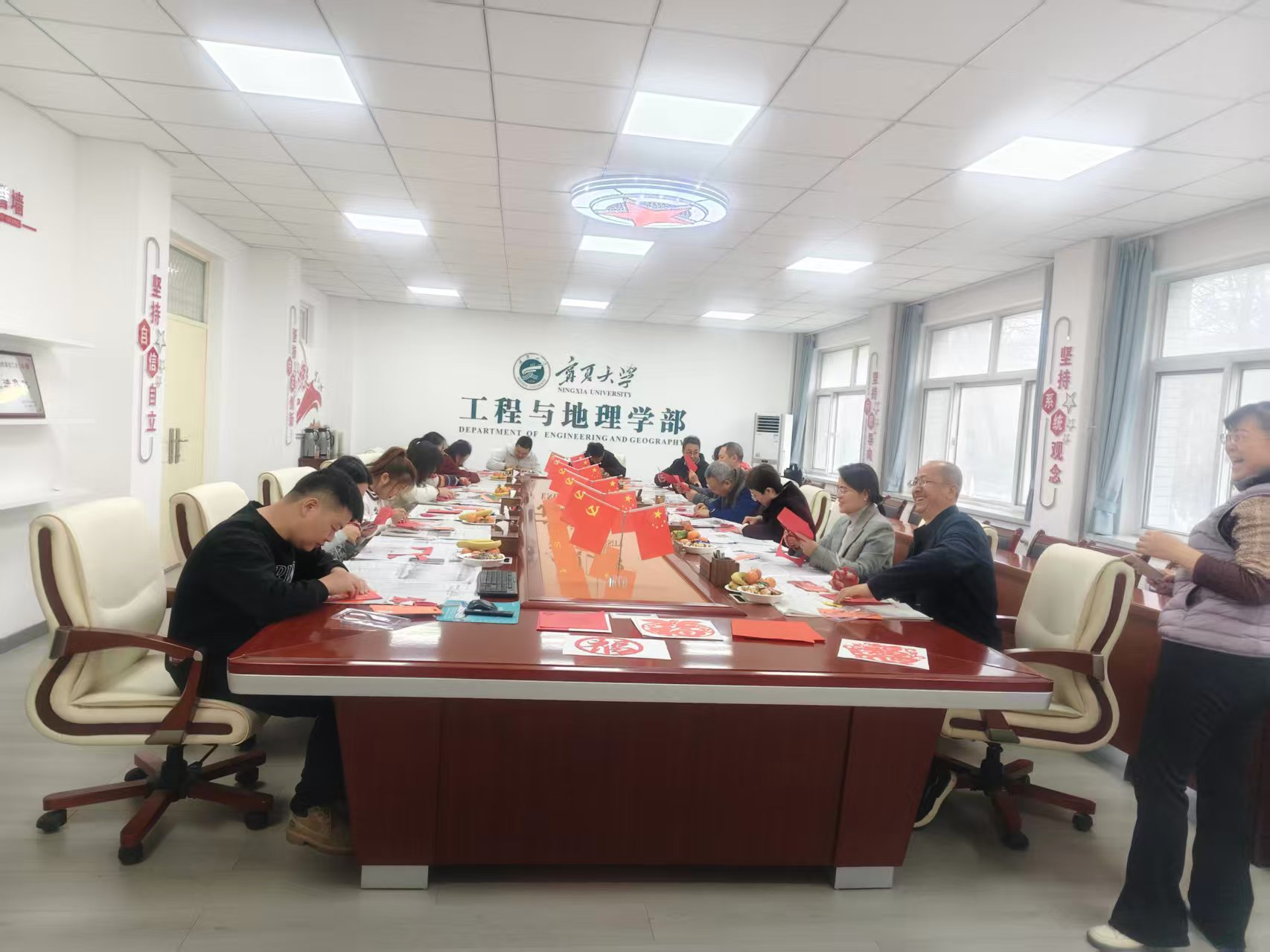 【宁夏大学新闻中心讯 工程与地理学部】岁末辞旧,华章日新。为丰富教职工文化生活,增强团队凝聚力,营造欢乐祥和的节日氛围,12 月 31 日上午,工程与地理学部举办“剪韵迎新 筑梦学部新程” 迎新年剪纸团建活动。学部班子成员、土木与水利工程学院班子成员、校工会副主席、学部全体教职工欢聚一堂,共赴这场充满传统韵味的指尖之约。