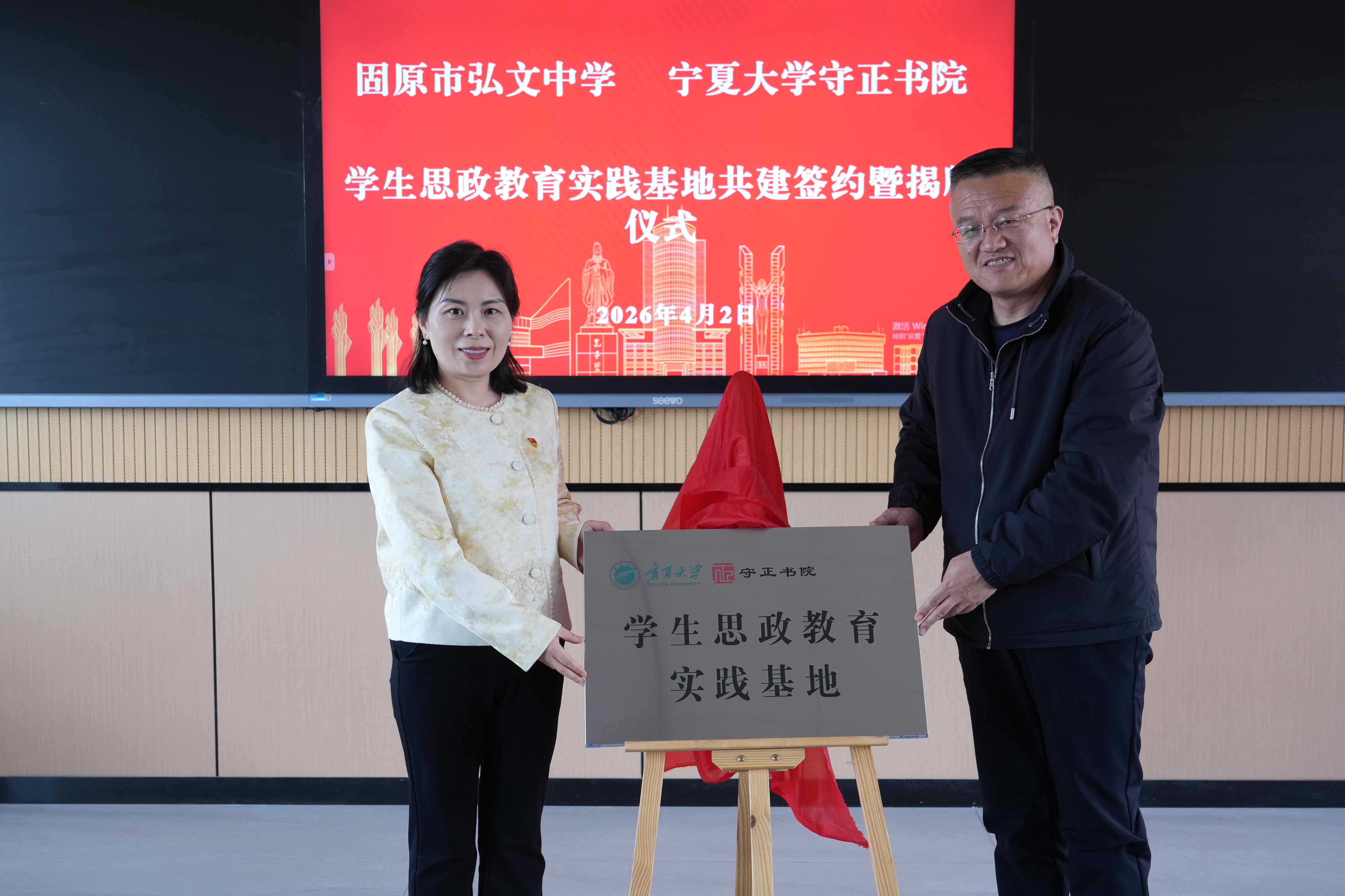 在与会人员的共同见证下,双方共同签订结对共建协议。守正书院党委书记、院长闫蓉与弘文中学党支部副书记陈锡学共同为“宁夏大学守正书院学生思政教育实践基地”揭牌。