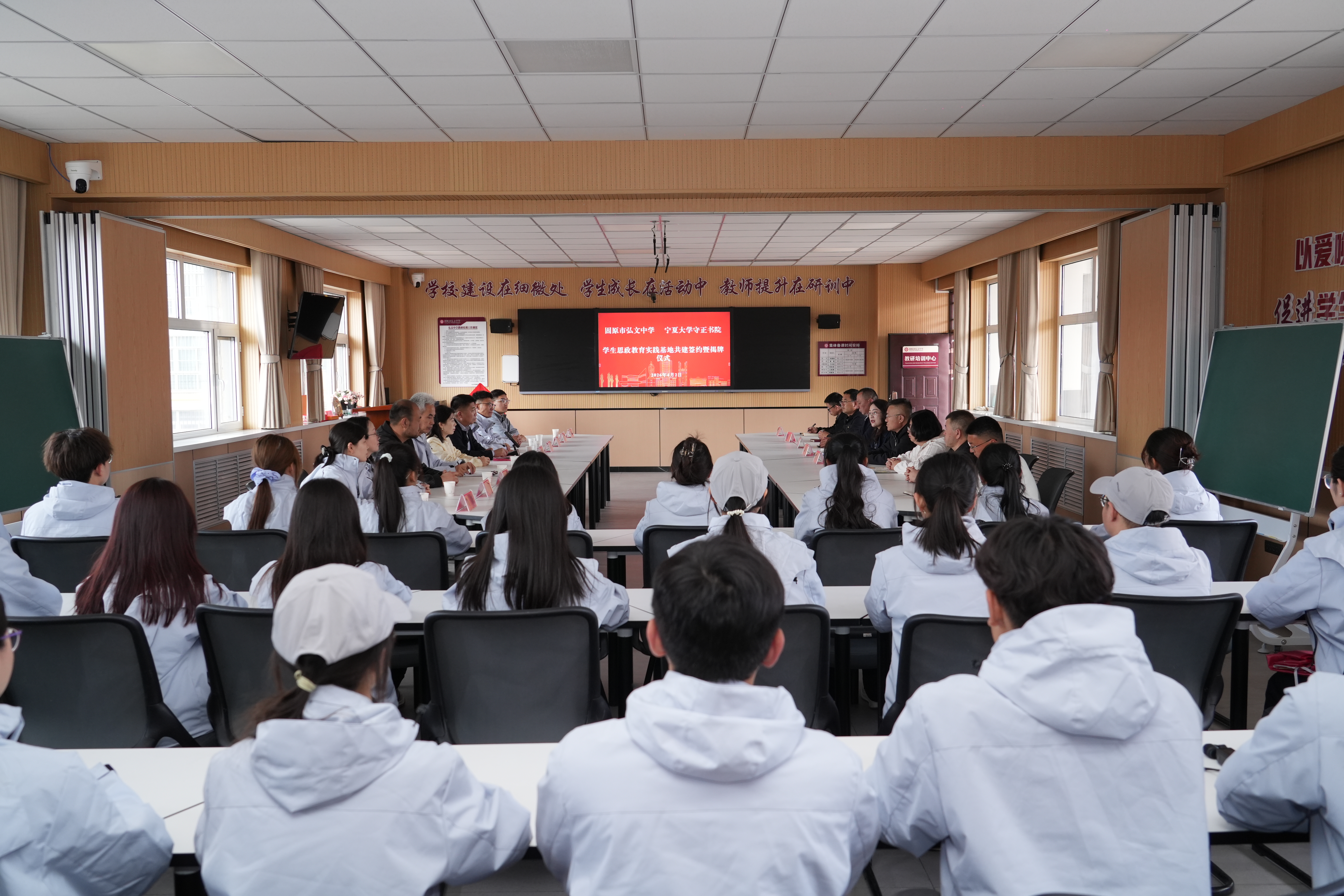 【宁夏大学新闻中心讯 守正书院】为全面落实立德树人根本任务,深化铸牢中华民族共同体意识教育,扎实推进大中小学思政教育一体化建设,4月2日下午,守正书院与固原市弘文中学学生思政教育实践基地共建仪式在弘文中学举行。仪式由守正书院党委副书记赵永军主持。