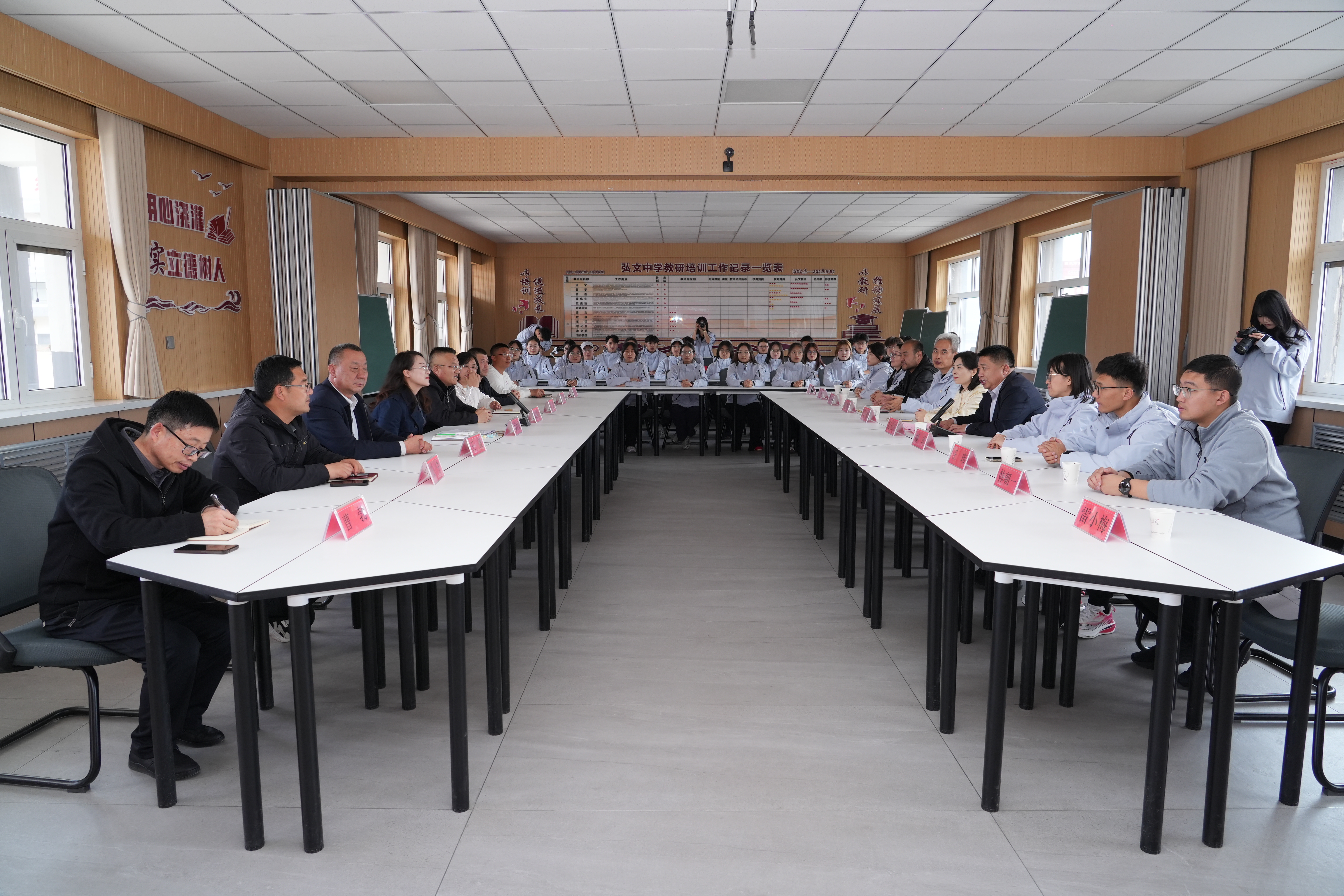 揭牌仪式后,与会人员实地调研了弘文中学思政教育阵地与校园文化建设情况,围绕思政课程共建、实践活动共育、红色资源共享等内容深入交流。