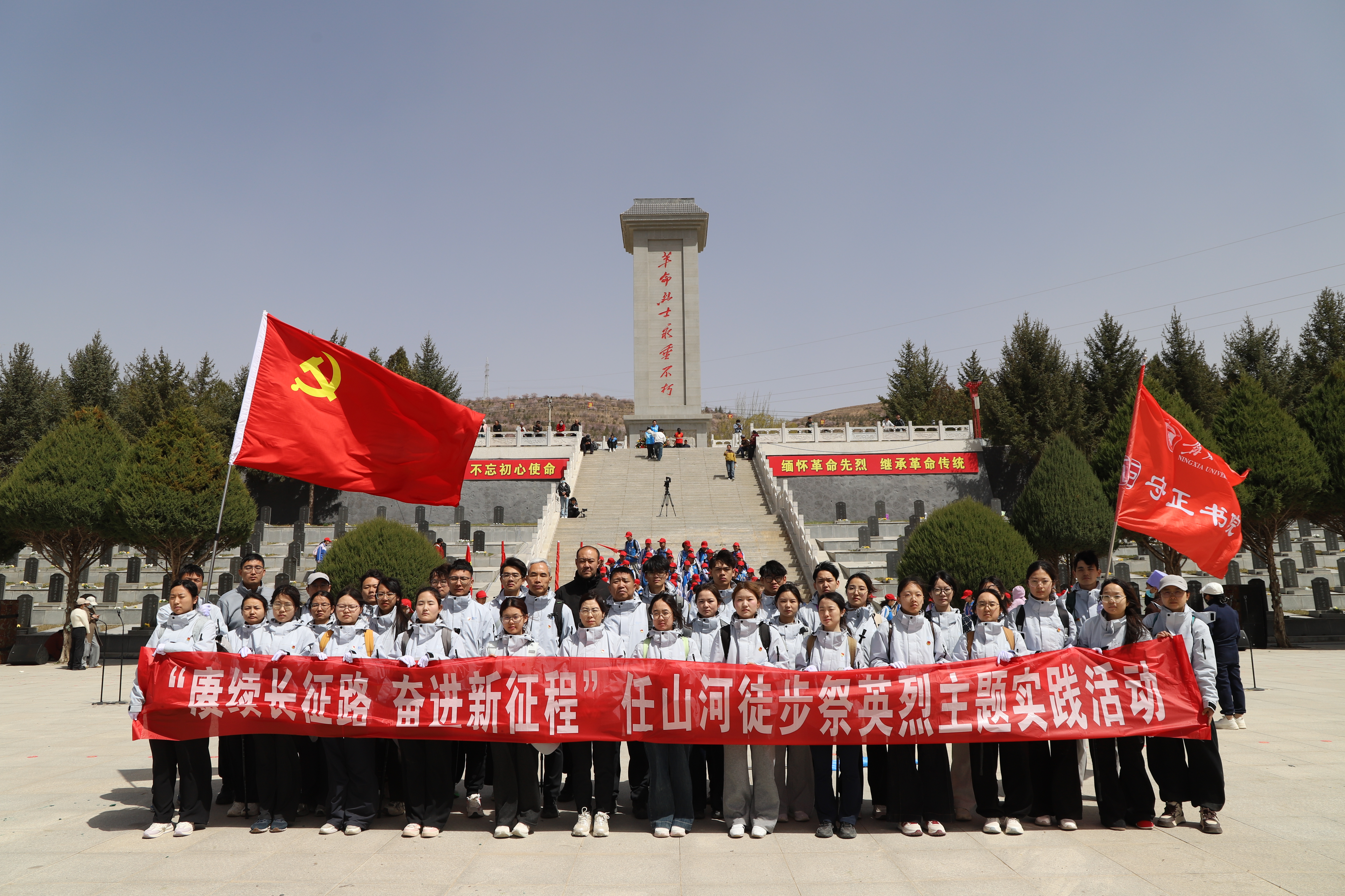 【宁夏大学新闻中心讯 守正书院】清明将至,宁夏固原任山河烈士陵园迎来一场跨越 31 年的红色传承。我校守正书院近 50 名师生正式加入固原二中、弘文中学往返 108 里徒步祭扫队伍,与千余名师生共同徒步祭英烈,以脚步丈量信仰高地,用赤诚缅怀革命先烈,将爱国主义教育、革命传统教育与铸牢中华民族共同体意识深度融合,走出一堂直抵人心的新时代 “行走的思政课”。