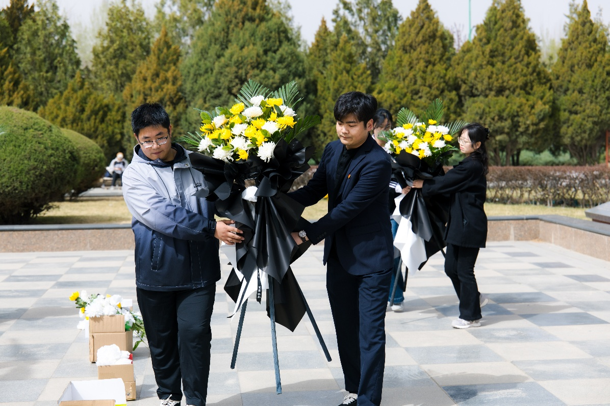 当日上午,苍松翠柏掩映,现场庄严肃穆,宁夏解放纪念碑巍然矗立,无声诉说着英雄们用生命守护人民安全的壮丽史诗。全体师生面向纪念碑肃立,奏唱中华人民共和国国歌,行注目礼。随后,全场低头默哀一分钟,向革命先烈致以最深切的哀思。默哀毕,学生代表上前敬献花篮。