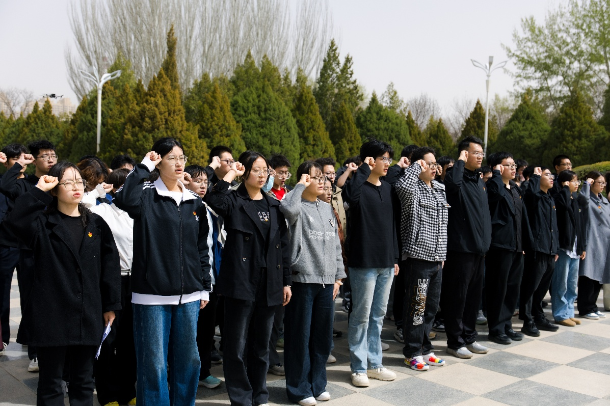 在庄严的宣誓环节,全体团员举起右拳,面向团旗,重温入团誓词。