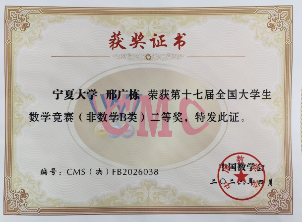 【宁夏大学新闻中心讯 数学统计学院 】4月17日至19日,第十七届全国大学生数学竞赛决赛在四川大学和成都理工大学两个考点举行。我校选派的7名学生共获得二等奖3项、三等奖4项。
