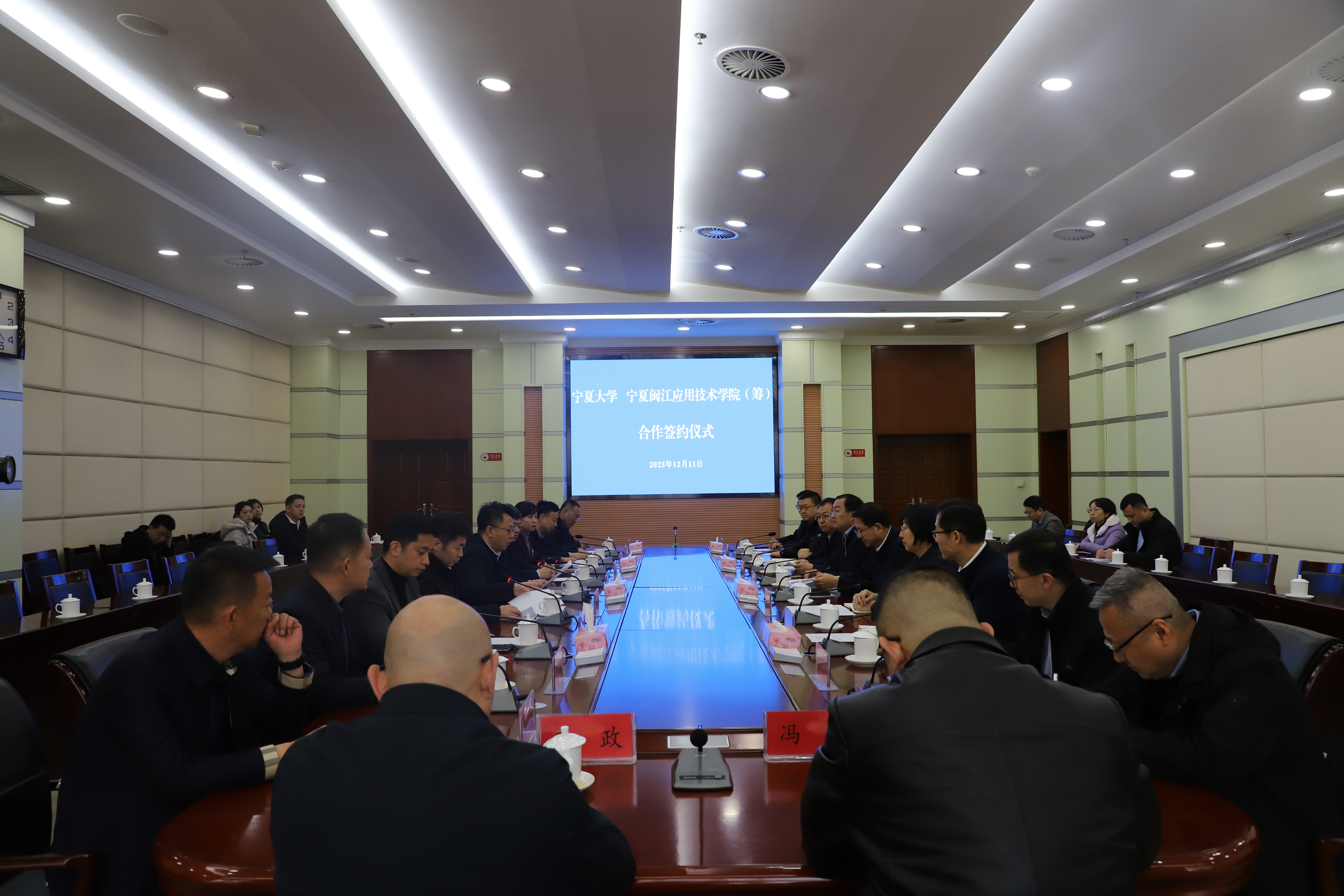 【宁夏大学新闻中心讯 王文娣/文、图】为进一步深化校地、校校合作协同创新,12月11日,校党委书记王宏伟,校党委副书记韩惠丽,校党委常委、副校长杨文法,校党委常委、副校长车进一行赴石嘴山市开展调研,并与宁夏闽江应用技术学院举行合作签约仪式。合作签约仪式在石嘴山市会议中心举行。石嘴山市委常委、组织部部长白建军,石嘴山市教育局二级巡视员、宁夏闽江应用技术学院党建指导员陈光华,福建时代人才教育科技集团董事长、宁夏闽江应用技术学院理事长林捷兴出席签约仪式。签约仪式由石嘴山市教育局党组书记、局长、市教育党工委书记张学仁主持。会上,杨文法与林捷兴代表两校签署了合作协议。白建军代表石嘴山市委、市政府对王宏伟一行的到来表示欢迎。他指出,此次合作是落实国家及自治区相关决策部署的具体行动,石嘴山市近年来以校校合作、产教融合作为产业转型的重要抓手,有效补齐教育短板,切实提升办学效益与人才培养质量。他希望宁夏大学充...