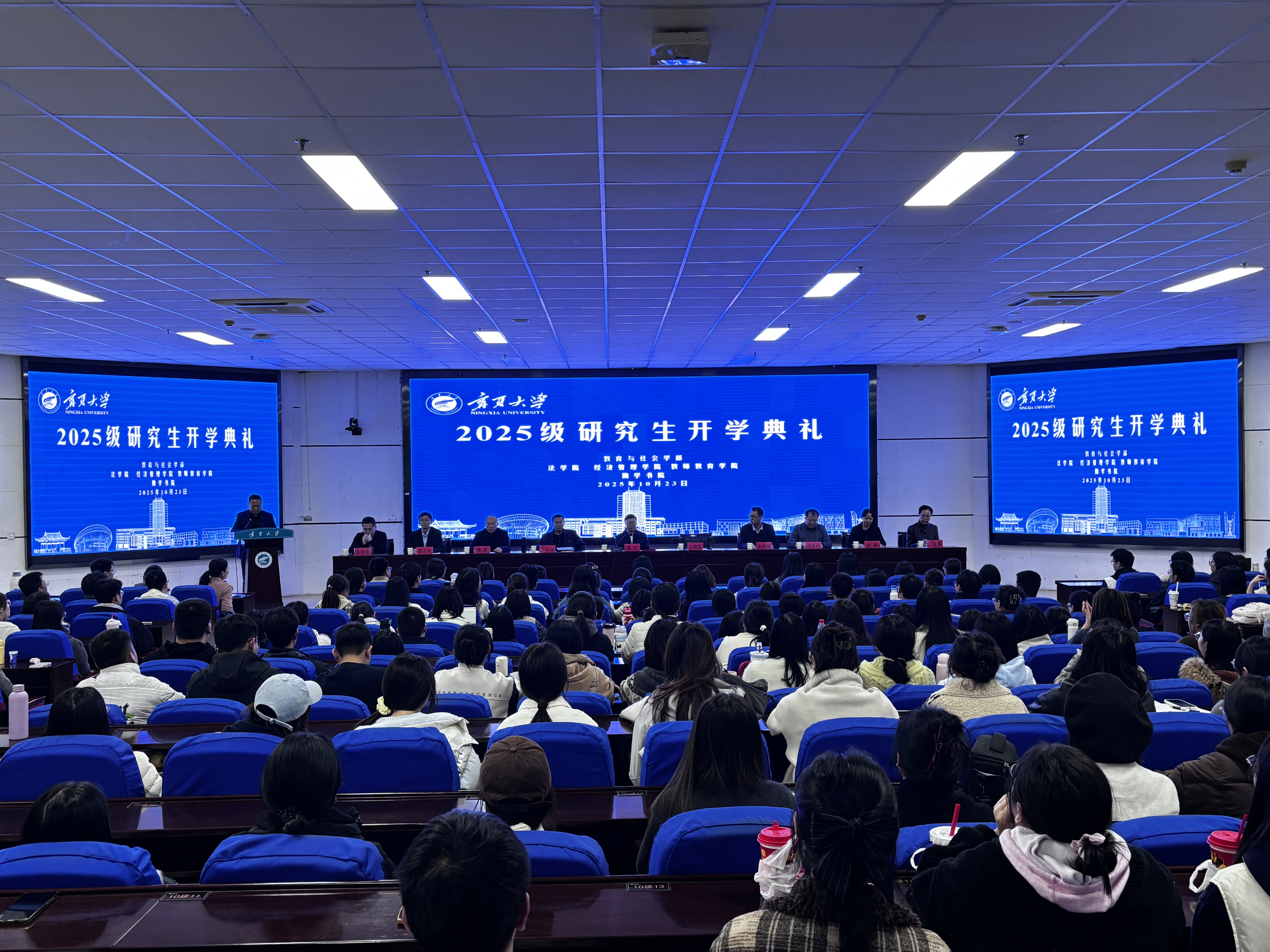 【宁夏大学新闻中心讯 教育与社会学部】执钥启新途,研途闪星辰。10月23日下午,我校教育与社会学部2025级研究生开学典礼在贺兰山校区东报告厅举行。校党委常委、副校长、教育与社会学部部长黄河出席典礼。学部及组成学院、勤学书院领导、导师和青年教师代表、新生辅导员与全体2025级336名硕士研究生共同参加了典礼。大会由教育与社会学部党委书记吕海军主持。典礼在庄严的国歌声中拉开帷幕。在师生代表发言环节中,硕士生导师代表教师教育学院咸富莲老师以宁夏大学学姐身份表达了对新生的热烈欢迎与殷切期望。法学院2025级法学研究生张荣同学、经济管理学院2025级理论经济学研究生鲁皓元同学依次发言,分享了他们对宁夏大学的热爱以及对新学期的期待与决心。勤学书院党委副书记靳永雄老师寄语新生们要珍惜时光、勤奋学习,努力成长为社会的栋梁之才。黄河在致辞勉励同学们要立鸿鹄之志,做心怀家国的追梦人;守学术之本,做求真务实的钻研者;强创新之能,...